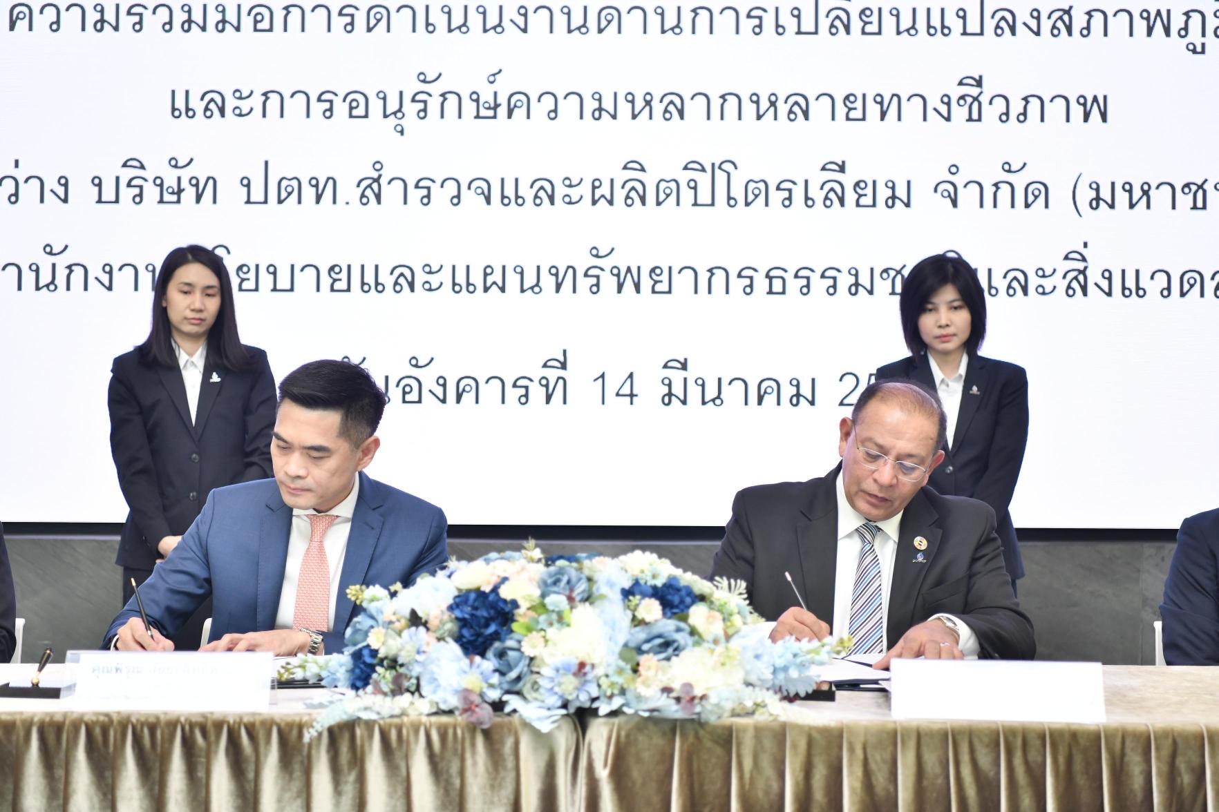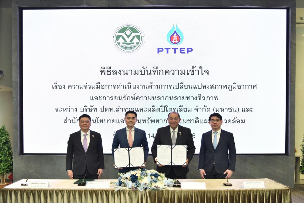 นายมนตรี ลาวัลย์ชัยกุล ประธานเจ้าหน้าที่บริหาร บริษัท ปตท.สำรวจและผลิตปิโตรเลียม จำกัด (มหาชน) หรือปตท.สผ. และนายพิรุณ สัยยะสิทธิ์พานิช เลขาธิการสำนักงานนโยบายและแผนทรัพยากรธรรมชาติและสิ่งแวดล้อมหรือ สผ. ร่วมลงนามบันทึกความเข้าใจเกี่ยวกับความร่วมมือในการดำเนินงานด้านการเปลี่ยนแปลงสภาพภูมิอากาศและการอนุรักษ์ความหลากหลายทางชีวภาพ เพื่อสนับสนุนและขับเคลื่อนการดำเนินการด้านการเปลี่ยนแปลงสภาพภูมิอากาศ ซึ่งเป็นส่วนหนึ่งที่จะช่วยให้ประเทศไทยบรรลุเป้าหมายความเป็นกลางทางคาร์บอนและมุ่งไปสู่สังคมคาร์บอนต่ำ ควบคู่ไปกับการอนุรักษ์ ฟื้นฟู ทรัพยากรธรรมชาติและความหลากหลายทางชีวภาพ