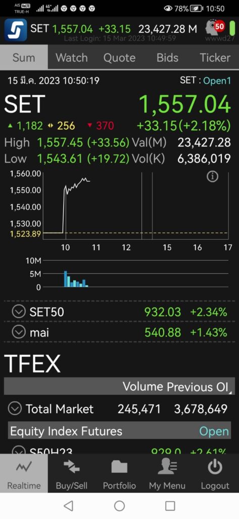 เมื่อเวลา 10.51 น.ดัชนี SET มาอยู่ที่ 1,557.04 จุด เพิ่มขึ้น 33.15 จุด หรือ 2.18%) นายประกิต สิริวัฒนเกตุกรรมการผู้จัดการ บลจ.เมอร์ชั่นพาร์ทเนอร์ กล่าว่า ระยะสั้นตลาดหุ้นไย ฟื้นตัวตามต่างประเทศ ที่คาดว่าธนาคารกลางสหรัฐ (เฟด ) จัดการปัญหา2 ธนาคารสหรัฐที่ล้มละลายได้ ประกอบกับเงินเฟ้อสหรัฐ ก.พ.ชะลอตัวตามคาด ที่ 6 % ส่งผลผลโมเมนตัมหุ้นไทย า ระยะสั้น ฟื้นตัว เป็นโอกาสของคนรอขาย ส่วนผู้ที่รอสะสมหุ้น ตลาดหุ้นไทย P/E วานนี้17เท่า ถือว่าต่ำมากเป็นช่วงน่าสะสมโดยเฉพาะ กลุ่มที่ PANIC แต่พื้นฐานดี น่าเก็บสะสม ระยะกลาง- ยาวหวังโมเมนตัม เปิดประเทศ ท่องเที่ยว, การเลือกตั้งและ การขยานตัวของเศรษฐกิจในประเทศ โดยเฉพาะกลุ่มธนาคารพาณิชย์