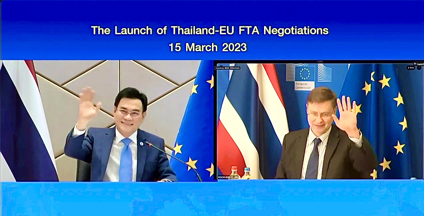 นนทบุรี 15 มี.ค.-รมว.พณ.เปิดประชุมข้ามประเทศผ่านระบบ VC นับหนึ่งเจรจาภายใต้กรอบ FTA ไทย-อียู อย่างเป็นทางการเพื่อสร้างแต้มต่อ ”สินค้า-บริการ-ลงทุน” ไทยกับ 27 ประเทศสมาชิกสหภาพยุโรป เดินหน้าสร้างเงิน สร้างอนาคตประเทศ