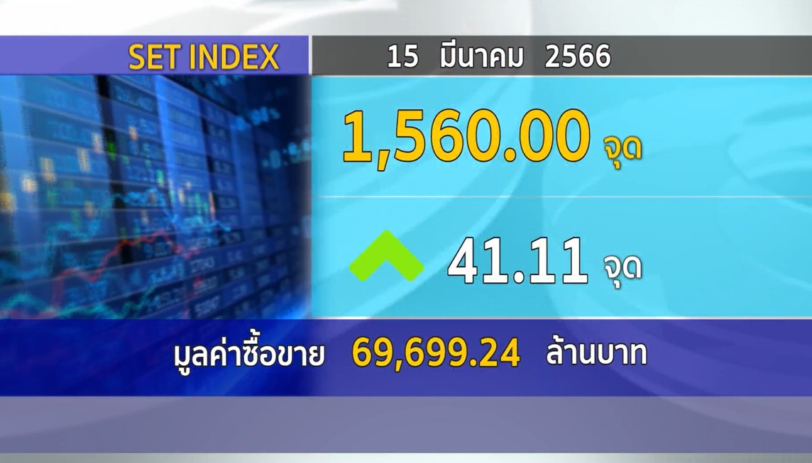 กทม. 15 มี.ค.-SET ปิดวันนี้ที่ 1,565.00 จุด เพิ่มขึ้น 41.11 จุด (+2.70%) มูลค่าการซื้อขาย 69,703.56 ล้านบาท