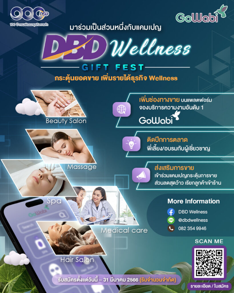 “กรมฯ ให้ความสำคัญในการส่งเสริมกลุ่มธุรกิจ wellness เป็นอย่างมาก จึงได้จัดกิจกรรมส่งเสริมการค้าธุรกิจบริการด้วยการตลาดดิจิทัล ซึ่งเป็นการเสริมสร้างศักยภาพและทักษะด้านการตลาด โดยพัฒนาเกี่ยวกับการบริหารจัดการร้านค้าบนแพลตฟอร์ม กิจกรรมส่งเสริมการตลาดดิจิทัล และการใช้ประโยชน์จากนวัตกรรมและเทคโนโลยีที่ทันสมัย โดยร่วมมือกับ บริษัท โกวาบิ (ไทยแลนด์) จำกัด และกลุ่มธุรกิจ Startup เพิ่มช่องทางการตลาดออนไลน์ที่สามารถเข้าถึงผู้ใช้บริการได้อย่างรวดเร็วและทั่วถึง โดยจะร่วมกันผลักดันผู้ประกอบธุรกิจ wellness เข้าสู่แพลตฟอร์ม GoWabi ซึ่งเป็นแพลตฟอร์มชั้นนำในธุรกิจบริการ เพื่อสร้างโอกาสทางการตลาด กระตุ้นการขาย ด้วยกิจกรรมส่งเสริมการตลาดผ่านแคมเปญ “DBD Wellness Gift Fest กระตุ้นยอดขาย เพิ่มรายได้ธุรกิจ wellness ซึ่งเชื่อว่าจะสามารถสร้างรายได้ให้กับผู้ประกอบธุรกิจ wellness และสามารถสร้างมูลค่าทางเศรษฐกิจให้กับประเทศ”นายทศพล กล่าว
