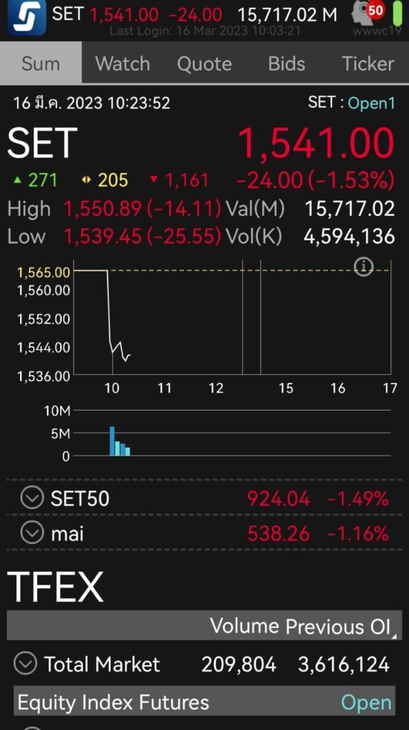 ตลาดหุ้นไทยเช้านี้ (16 มี.ค. 66) ดัชนี SET Index เปิดตลาดอยู่ที่ระดับ 1,543.91 จุด ปรับลง -21.09 จุด หรือคิดเป็น-1.35% มีมูลค่าซื้อขายรวมประมาณ 5,314 ล้านบาท ในช่วงเปิดตลาด และเมื่อเวลา 10.23 น. เคลื่อนไหวที่ระดับ1,541 จุด ปรับลง -21.00 จุด หรือคิดเป็น -1.53%