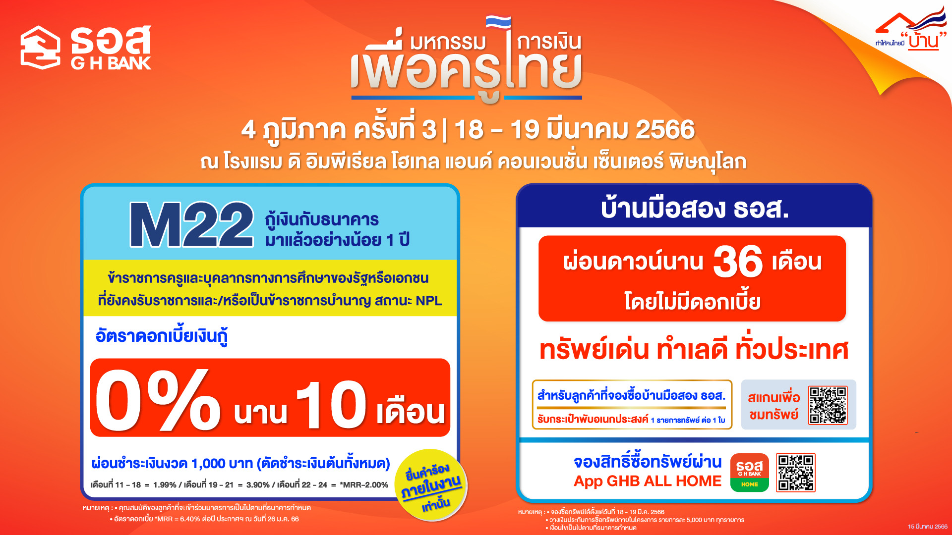 ธนาคารอาคารสงเคราะห์ (ธอส.) นำมาตรการแก้หนี้และผลิตภัณฑ์ทางการเงินเข้าร่วมงานมหกรรมการเงินเพื่อครูไทย 4 ภูมิภาค ครั้งที่ 3 จ.พิษณุโลก เพื่อให้ข้าราชการครูและบุคลากรทางการศึกษาใน จ.พิษณุโลก ตากเพชรบูรณ์ สุโขทัย และอุตรดิตถ์ ได้รับความช่วยเหลืออย่างครบวงจรและมีคุณภาพชีวิตที่ดีขึ้น นำโดยมาตรการช่วยเหลือลูกค้าปัจจุบันของธนาคาร มาตรการ 22 [M22] สำหรับลูกค้าข้าราชการครูและบุคลากรทางการศึกษาของรัฐหรือเอกชน ที่ยังคงรับราชการและ/หรือเป็นข้าราชการบำนาญ ที่กู้เงินกับธนาคารมาแล้วไม่น้อยกว่า 1 ปี ที่มีสถานะNPL หรือ สถานะ NPL ที่อยู่ระหว่างการใช้มาตรการ/ปรับโครงสร้างหนี้