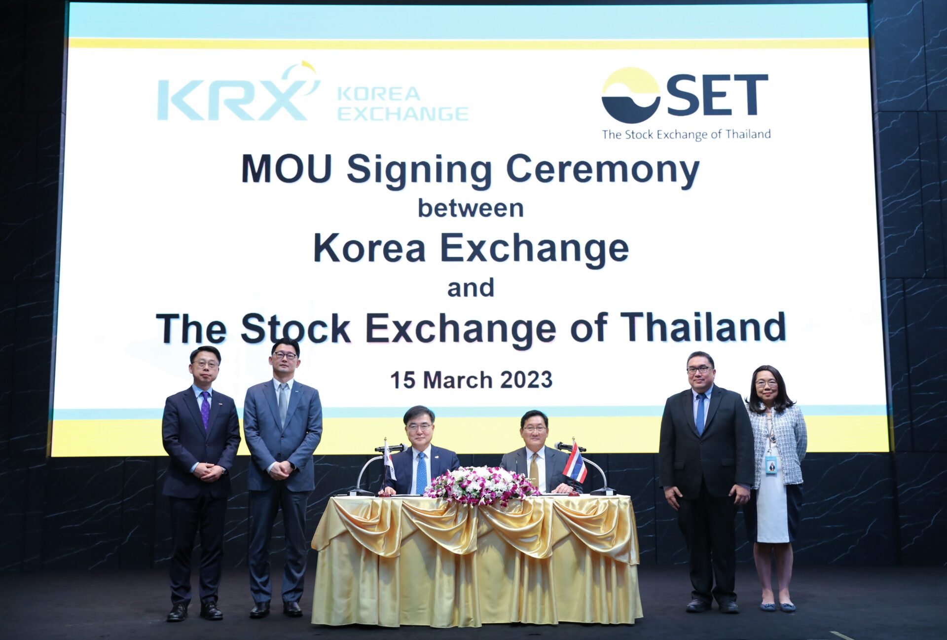 นายภากร ปีตธวัชชัย กรรมการและผู้จัดการ ตลาดหลักทรัพย์แห่งประเทศไทย (ตลท.) และ นาย ซน บยองดู ประธานและผู้จัดการ ตลาดหลักทรัพย์เกาหลี ร่วมลงนามบันทึกข้อตกลงความร่วมมือ (MOU) ระหว่างตลาดหลักทรัพย์ฯ กับตลาดหลักทรัพย์เกาหลี (Korea Exchange : KRX) ในการพัฒนาผลิตภัณฑ์ที่เชื่อมโยงระหว่างกัน ส่งเสริมผลิตภัณฑ์เพื่อความยั่งยืน แลกเปลี่ยนข้อมูลและประสบการณ์ด้าน IT รวมถึงส่งเสริมความร่วมมือในด้านการลงทุน เพื่อเพิ่มโอกาสการลงทุนระหว่างสองประเทศ ความร่วมมือระหว่างกันมีระยะเวลา 5 ปี.-สำนักข่าวไทย