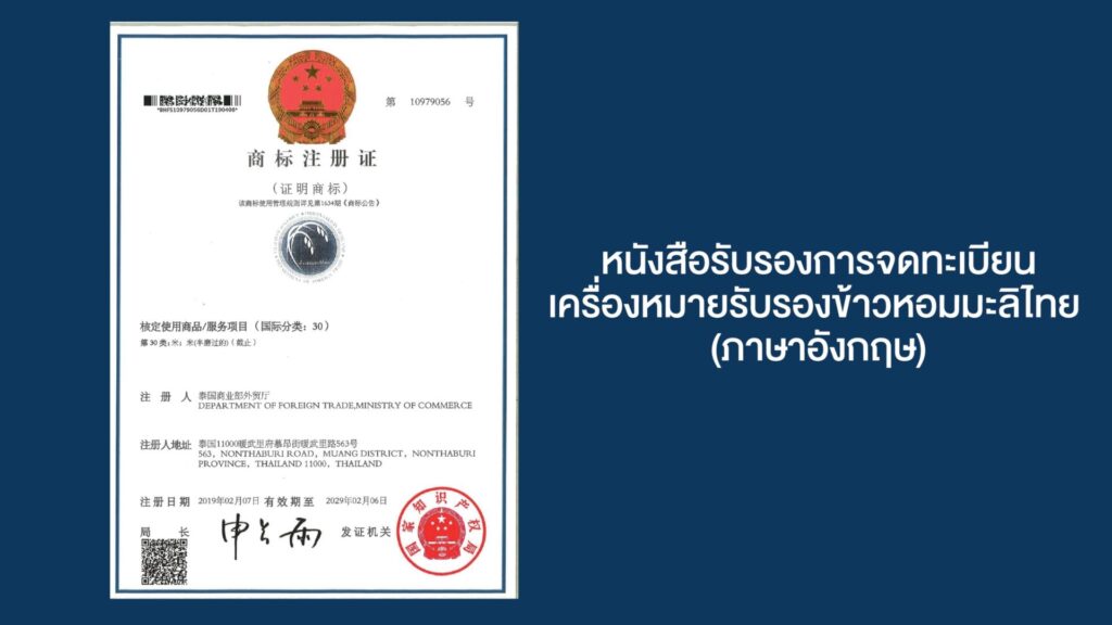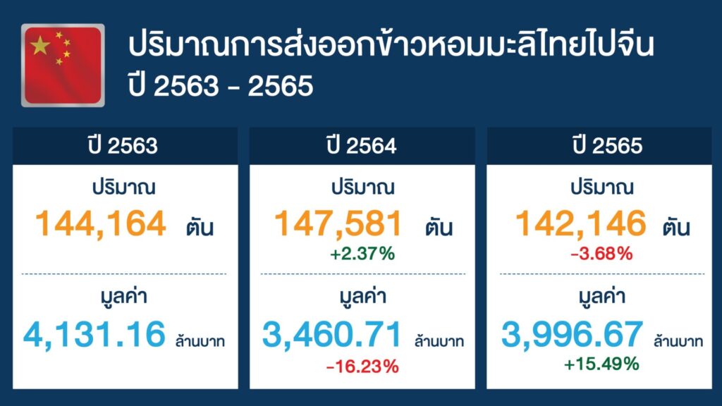 ส่วนทางการไทย จากการตรวจสอบเบื้องต้นทั้งเครื่องหมายการค้า และการละเมิดทรัพย์สินทางปัญญา ยังไม่พบผิดกฎหมาย ต้องติดตามพฤติกรรมความผิดอีกครั้ง และการดำเนินการใดๆ ต้องผ่านทางการทูตเท่านั้น เช่นเดียวกับการประเมินผลกระทบความเสียหาย ที่ยังต้องใช้เวลาอีกระยะ เพื่อนำสถิติการส่งออกข้าวหอมมะลิมาเปรียบเทียบ อาจจะในช่วง 3-6 เดือนที่เกิดปัญหานี้ เทียบกับช่วงเดียวกันของปีก่อนว่าปริมาณการส่งออกลดลงมากน้อยแค่ไหน โดยปริมาณการส่งออกข้าวหอมมะลิไทยไปจีน ในปี 2565 ปริมาณกว่า 142,000 ตัน ลดลงจากปีก่อนหน้า 3.68% จากการส่งออกข้างทุกชนิดที่ 7 แสน 5 หมื่นตัน ซึ่งยังเชื่อว่า เป็นผลกระทบระยะสั้นเท่านั้น เพราะผู้บริโภคชาวจีน ตื่นตัวในการตรวจสอบก่อนซื้อ