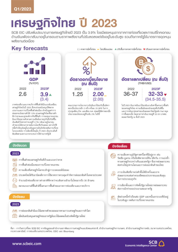 กรุงเทพฯ 17 มี.ค. – SCB EIC ปรับเพิ่มจีดีพีปี 2566 เป็น 3.9% จากแรงหนุนภาคการท่องเที่ยวและการบริโภคเอกชน รวมถึงเศรษฐกิจโลกที่ขยายตัวดีกว่าคาด ยังต้องจับตา ความเสี่ยงใหม่จากวิกฤตเสถียรภาพระบบการเงินโลก