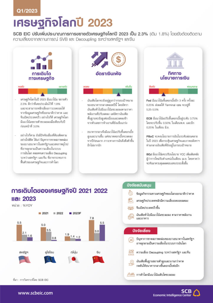 นอกจากนี้ สถานการณ์ Silicon Valley Bank (SVB) ในสหรัฐฯ ที่มีปัญหาขาดสภาพคล่องและถูกปิดลง คาดว่าจะทำให้สภาพคล่องและความเชื่อมั่นในตลาดการเงินโลกปรับลดลงเล็กน้อยในระยะสั้น ความเสี่ยงที่จะลุกลามจนเกิดวิกฤตการเงินโลกเหมือนในปี 2551 ยังมีน้อย แต่มองว่าเป็นปัจจัยเสี่ยงสำคัญที่ต้องติดตามใกล้ชิด เช่นเดียวกับความเสี่ยงจากความขัดแย้งทางภูมิรัฐศาสตร์ระหว่างสหรัฐฯ และจีนที่อาจกระทบเศรษฐกิจ การค้า และห่วงโซ่อุปทานโลกได้