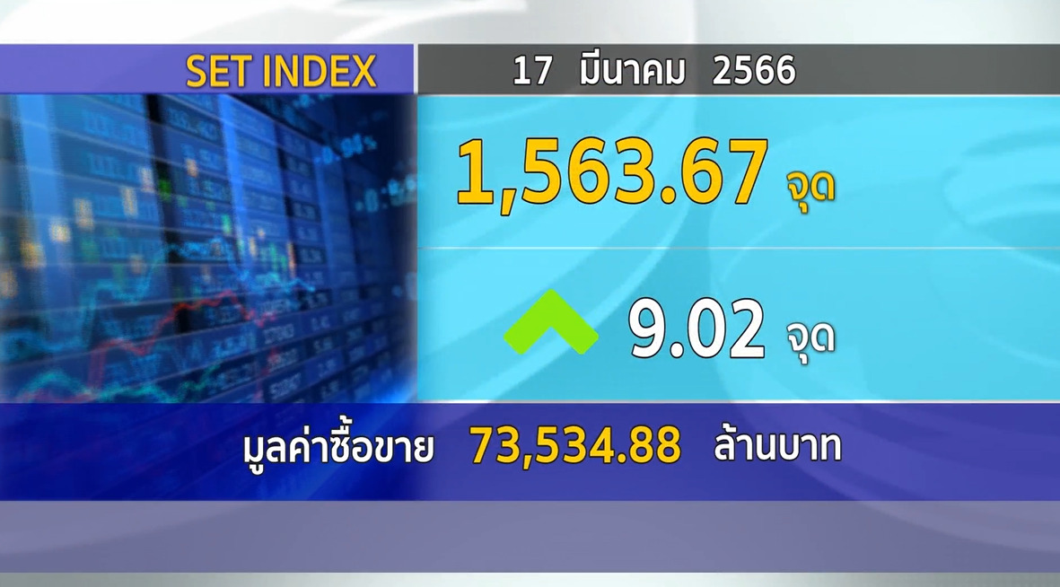 กทม. 17 มี.ค.-SET ปิดวันนี้ที่ 1,563.67 จุด เพิ่มขึ้น 9.02 จุด (+0.58%) มูลค่าการซื้อขาย 73,534.88 ล้านบาท