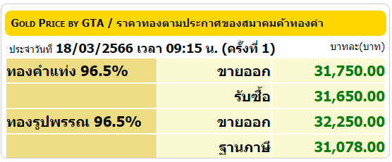 สมาคมค้าทองคำแจ้ง ราคาทองคำแท่งวันเสาร์ที่ 18 มี.ค.66 ครั้งที่ 1 เวลา 09:15 น. ปรับขึ้น 500บาทต่อ 1 บาททองคำ ร้านทองซื้อเข้าบาทละ 31,650 บาท ขายออกบาทละ 31,750 บาท