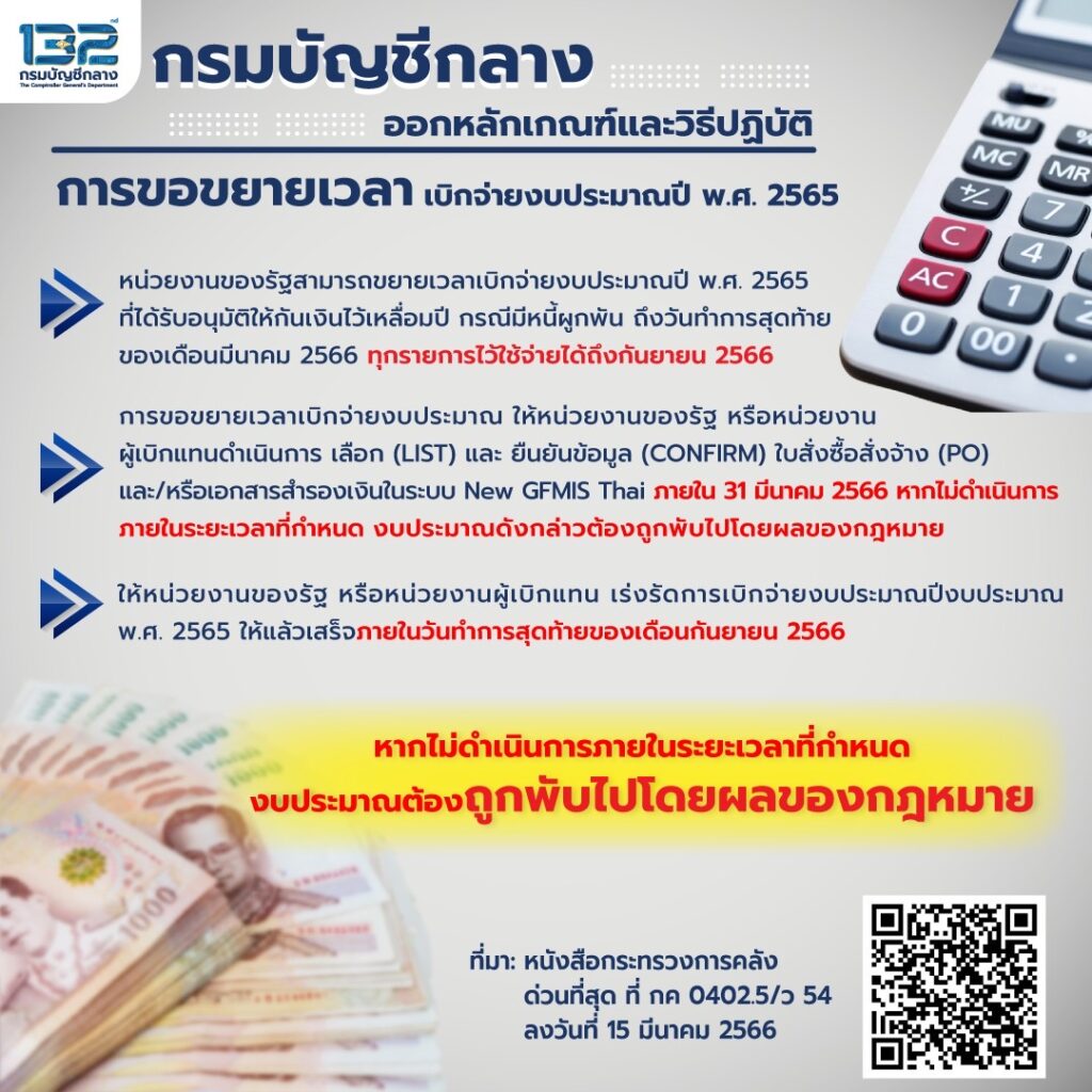 กรุงเทพฯ 20 มี.ค.-กรมบัญชีกลาง ขยายเวลาเบิกจ่ายงบเหลื่อมปี 65 แนะยืนยันความจำเป็นใช้งบ ภายใน 31 มี.ค. 66 กำชับไม่ทำตามเงื่อนไขถูกตัดงบ