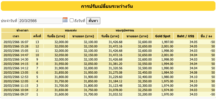 วันที่ 20 มีนาคม 2566 ผู้สื่อข่าวรายงานว่า ในระหว่างวันราคาทองคำมีการปรับตัวขึ้นลง 13 ครั้ง โดยราคาทองแท่งสูงสุดในวันนี้ขายออกแตะ 32,150 บาท โดยเป็นการปรับตัวลดลง 3 ครั้ง รวม 150 บาท และปรับตัวขึ้น 10 ครั้ง รวม500 บาท โดยราคาทองคำโลก (Gold Spot) ได้ปรับตัวขึ้นไปทดสอบที่ระดับ 2,001 ดอลลาร์ต่อออนซ์ถึง 2 ครั้ง ในเวลา 14.47 น. และเวลา 15.28 น. นับว่าเป็นระดับสูงในสุดตั้งแต่ต้นปี (YTD)