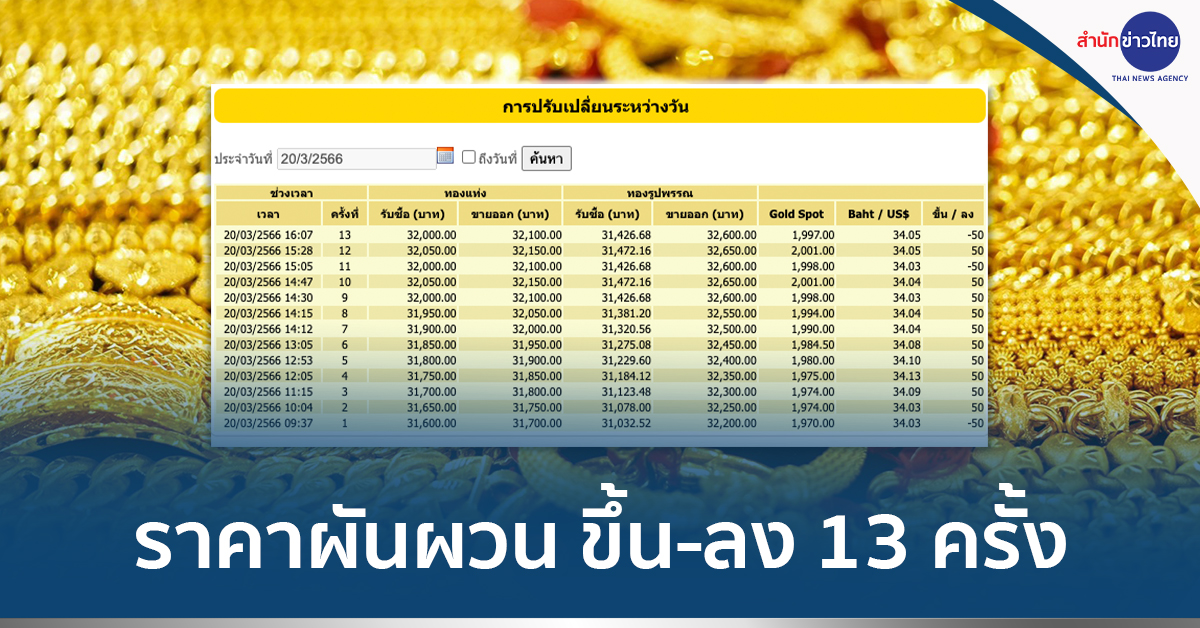 กรุงเทพฯ 20 มี.ค- ราคาทองผันผวน ราคาทองคำโลก (Gold Spot) พุ่งขึ้นไปแตะ 2,001 ดอลลาร์ต่อออนซ์ และระหว่างวันราคาทองคำในไทย ปรับขึ้นลง 13 ครั้ง