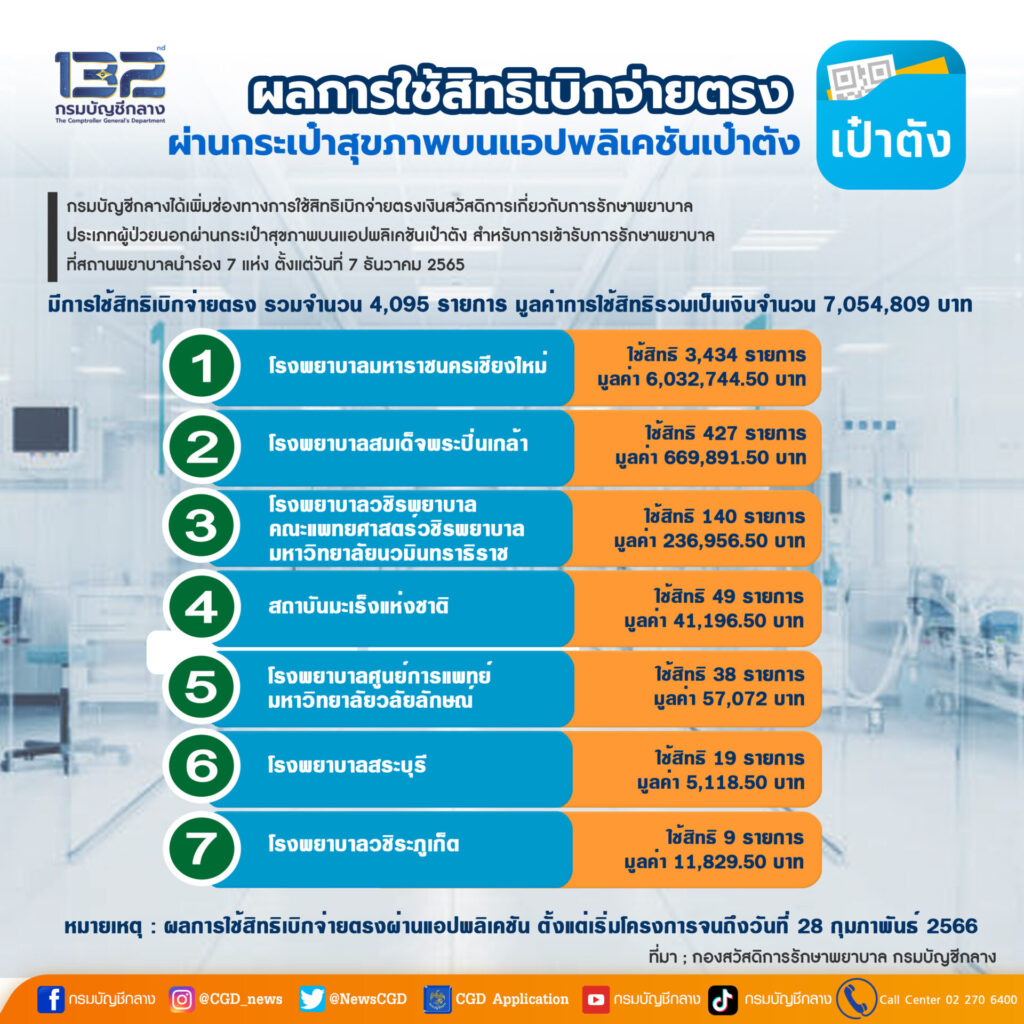 นางสาวกุลยา ตันติเตมิท อธิบดีกรมบัญชีกลาง เปิดเผยว่า หลังจากกรมบัญชีกลาง ได้เพิ่มช่องทางการใช้สิทธิเบิกจ่ายตรง ในการรักษาพยาบาลประเภทผู้ป่วยนอกผ่านกระเป๋าสุขภาพบนแอปพลิเคชัน “เป๋าตัง” สำหรับ ข้าราชการและครอบครัว ในการเข้ารับการรักษาพยาบาล ตั้งแต่วันที่ 7 ธันวาคม 2565 สำหรับผลการใช้สิทธิเบิกจ่ายตรงผ่านแอป “เป๋าตัง” ตั้งแต่เริ่มโครงการจนถึง 28 กุมภาพันธ์ 66 พบว่า เบิกจ่ายตรง รวมทั้งสิ้น 4,095 รายการ มูลค่า 7 ล้านบาท โดยโรงพยาบาลมหาราชนครเชียงใหม่ ใช้สิทธิมากสุด 3,434 รายการ มูลค่า 6 ล้านบาท