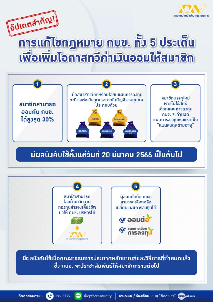 3. สมาชิก กบข. บรรจุใหม่ หากไม่ใช้สิทธิเลือกแผนการลงทุน กบข. จะกำหนดแผนการลงทุนเริ่มแรกเป็นแผนสมดุลตามอายุ จากเดิม สมาชิกบรรจุใหม่จะถูกกำหนดให้อยู่ในแผนหลัก ซึ่งใน 3 ประเด็นนี้ มีผลบังคับใช้ตั้งแต่วันที่ 20 มีนาคม 2566 ที่ผ่านมา 4. สมาชิก กบข. สามารถโอนย้ายเงินจากกองทุนสำรองเลี้ยงชีพมาให้ กบข. บริหารได้ และ 5. ผู้ออมต่อกับ กบข. สามารถเลือกเปลี่ยนแผนการลงทุนได้ จากเดิม ถูกกำหนดให้ลงทุนในแผนเดิมก่อนออกจากราชการ ใน 2 ประเด็นนี้ จะมีผลบังคับใช้เมื่อคณะกรรมการ กบข. ประกาศหลักเกณฑ์และวิธีการที่กำหนดแล้ว