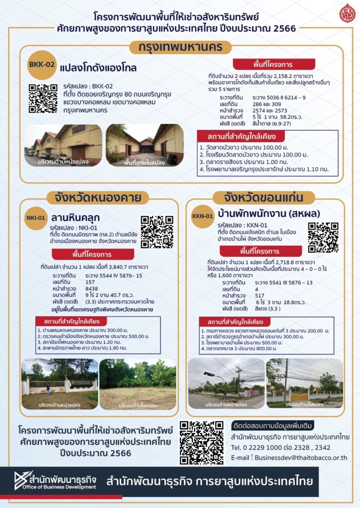 การยาสูบแห่งประเทศไทย (ยสท.) เตรียมเปิดประมูลให้เช่าที่ดินทำเลดีระยะยาว 30 ปี จำนวน 3 แปลง ได้แก่ “แปลงโกดังแองโกล” โฉนดเลขที่ 6009 และ 23614 เนื้อที่ 5.1 ไร่ ตั้งอยู่ในซอยเจริญกรุง 80 กรุงเทพมหานคร ภายในพื้นที่มีอาคารคลังสินค้า 2 หลัง พื้นที่อาคาร 6,140 ตารางเมตร ที่ตั้งโครงการใกล้กับเอเชียทีค เดอะริเวอร์ฟรอนต์และย่านธุรกิจถนนสาทร สีลม