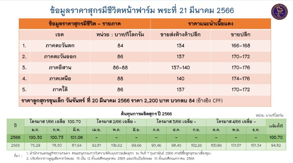 สมาคมผู้เลี้ยงสุกรแห่งชาติรายงานข้อมูลสภาวะตลาดสุกรมีชีวิตหน้าฟาร์มว่า บางพื้นที่ได้ปรับราคาจำหน่ายขึ้นเมื่อวันที่ 21 มีนาคม ซึ่งเป็นการปรับขึ้นครั้งที่ 2 จากที่ปรับครั้งแรกเมื่อวันที่ 14 มีนาคม โดยราคาสุกรหน้าฟาร์มตกต่ำต่อเนื่องและต่ำกว่าต้นทุนการผลิต โดยราคาเมื่อวันที่ 6 มีนาคม อยู่ระหว่าง 76-88 บาทต่อกิโลกรัม ต่อมาเมื่อวันที่ 14 มีนาคม ราคาต่ำสุดปรับขึ้นมาอยู่ที่ 80 บาทต่อกิโลกรัม และสูงสุดยังทรงตัวที่ 88 บาทต่อกิโลกรัม โดยเป็นผลจากการประชุมร่วมของผู้เลี้ยงสุกรแต่ละภูมิภาค ที่เห็นว่าราคาหน้าฟาร์มยังคงต่ำกว่าต้นทุนการเลี้ยงเฉลี่ยของไตรมาส 1/2566 ที่ 100.70 บาทต่อกิโลกรัม ประกอบกับทุกภูมิภาคมีผลผลิตสุกรลดลงทั้งปริมาณและน้ำหนักสุกรขุนรอการจำหน่าย จึงมีมติปรับฐานราคาหน้าฟาร์มจากการจำหน่ายจริงระหว่างสัปดาห์บวก 4 บาทต่อกิโลกรัม เพื่อลดความเสียหายให้เกษตรกร