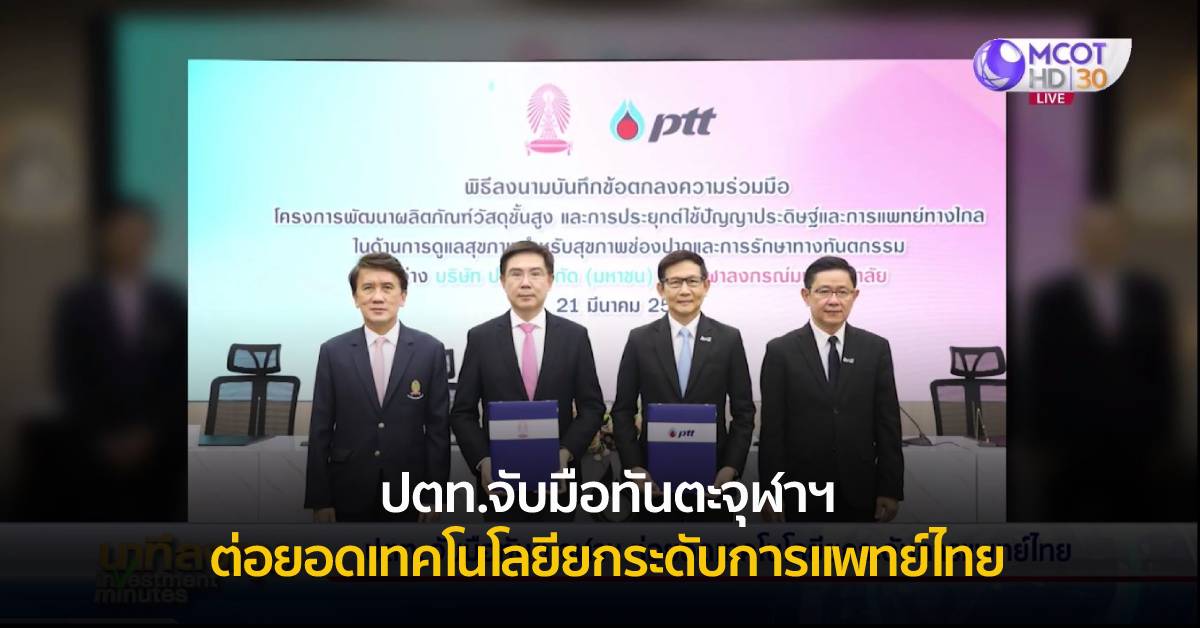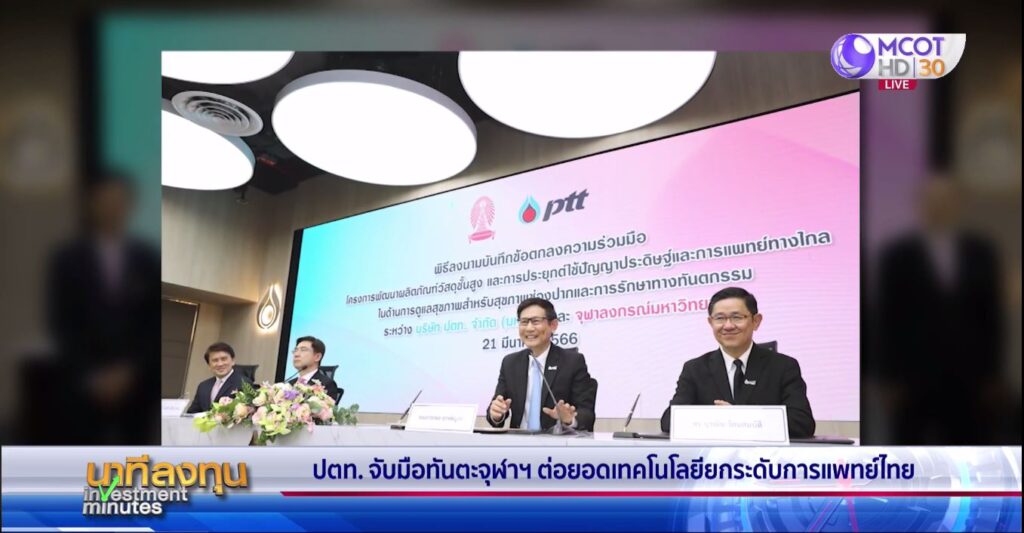 กทม. 23 มี.ค. – นายอรรถพล ฤกษ์พิบูลย์ ประธานเจ้าหน้าที่บริหารและกรรมการผู้จัดการใหญ่ บริษัท ปตท. จำกัด (มหาชน) พร้อมด้วย ศ.ดร.บัณฑิต เอื้ออาภรณ์ อธิการบดีจุฬาลงกรณ์มหาวิทยาลัย ศ.ทพ.ดร.พรชัย จันศิษยานนท์ คณบดีคณะทันตแพทยศาสตร์ จุฬาลงกรณ์มหาวิทยาลัย และ ดร.บุรณิน รัตนสมบัติ ประธานเจ้าหน้าที่ปฏิบัติการกลุ่มธุรกิจใหม่และโครงสร้างพื้นฐาน บริษัท ปตท. จำกัด (มหาชน) ร่วมพิธีลงนามบันทึกข้อตกลงความร่วมมือระหว่างกันในโครงการพัฒนาผลิตภัณฑ์วัสดุชั้นสูงและการประยุกต์ใช้ปัญญาประดิษฐ์ และการแพทย์ทางไกลในด้านการดูแลสุขภาพสำหรับสุขภาพช่องปากและการรักษาทางทันตกรรม