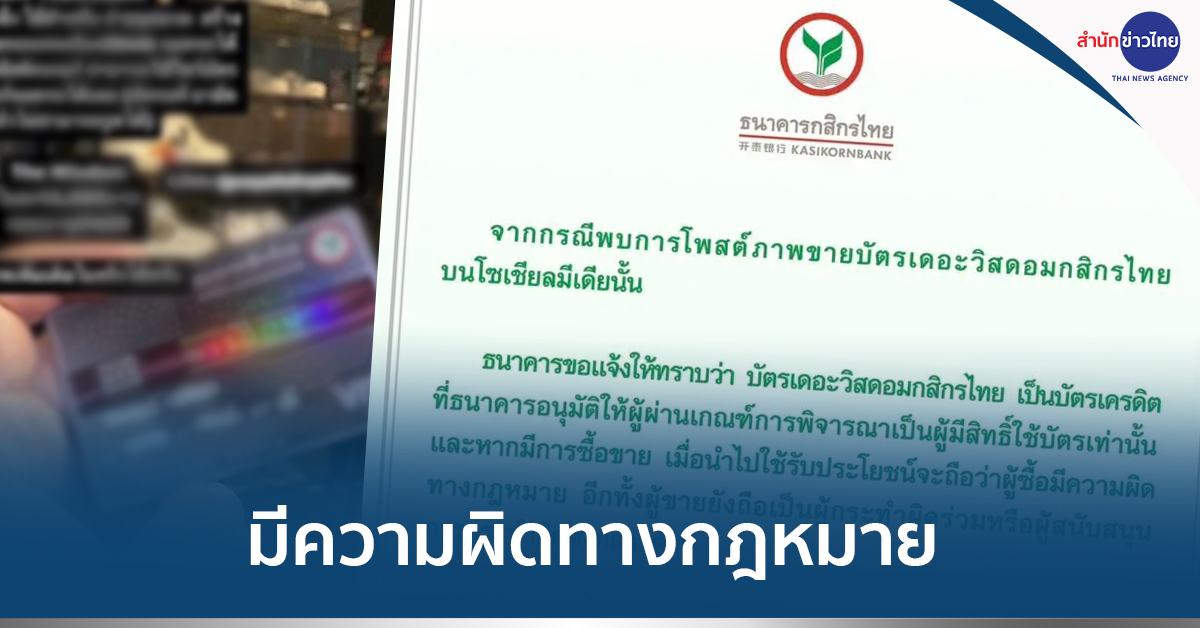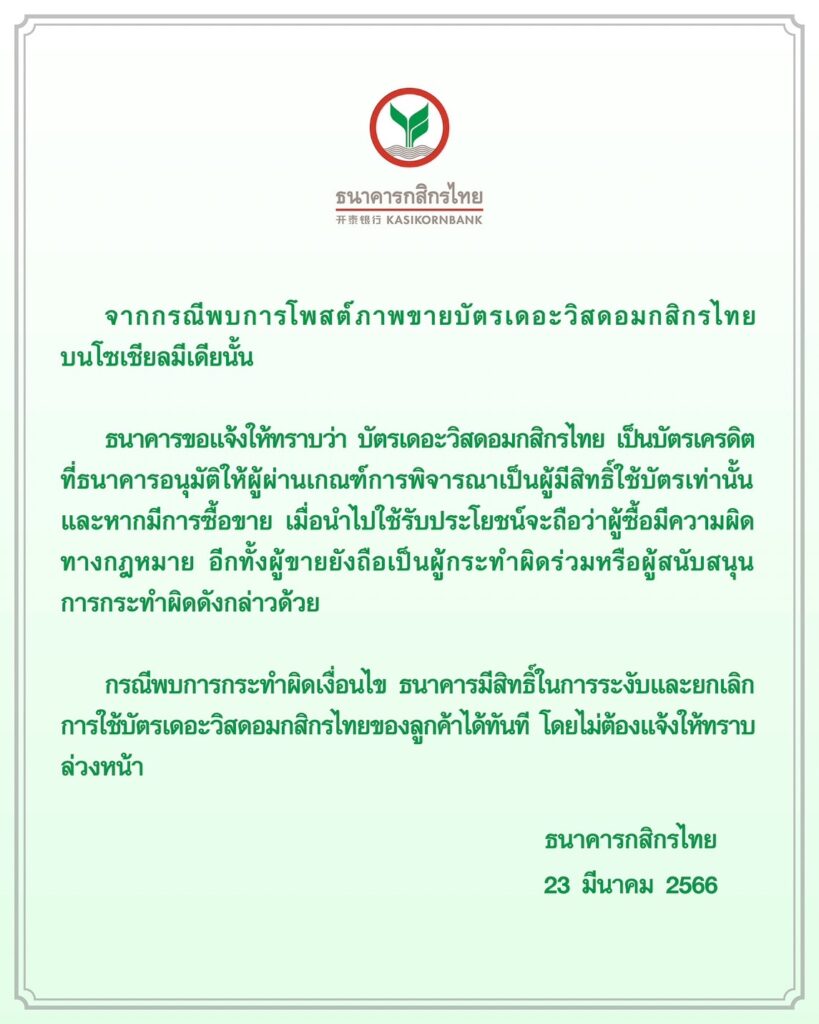 กรุงเทพฯ 23 มี.ค.-ธนาคารกสิกรไทยเผยกรณีพบการโพสต์ภาพขายบัตรเดอะวิสดอมกสิกรไทย บนโซเชียลมีเดีย มีความผิดทางกฎหมาย