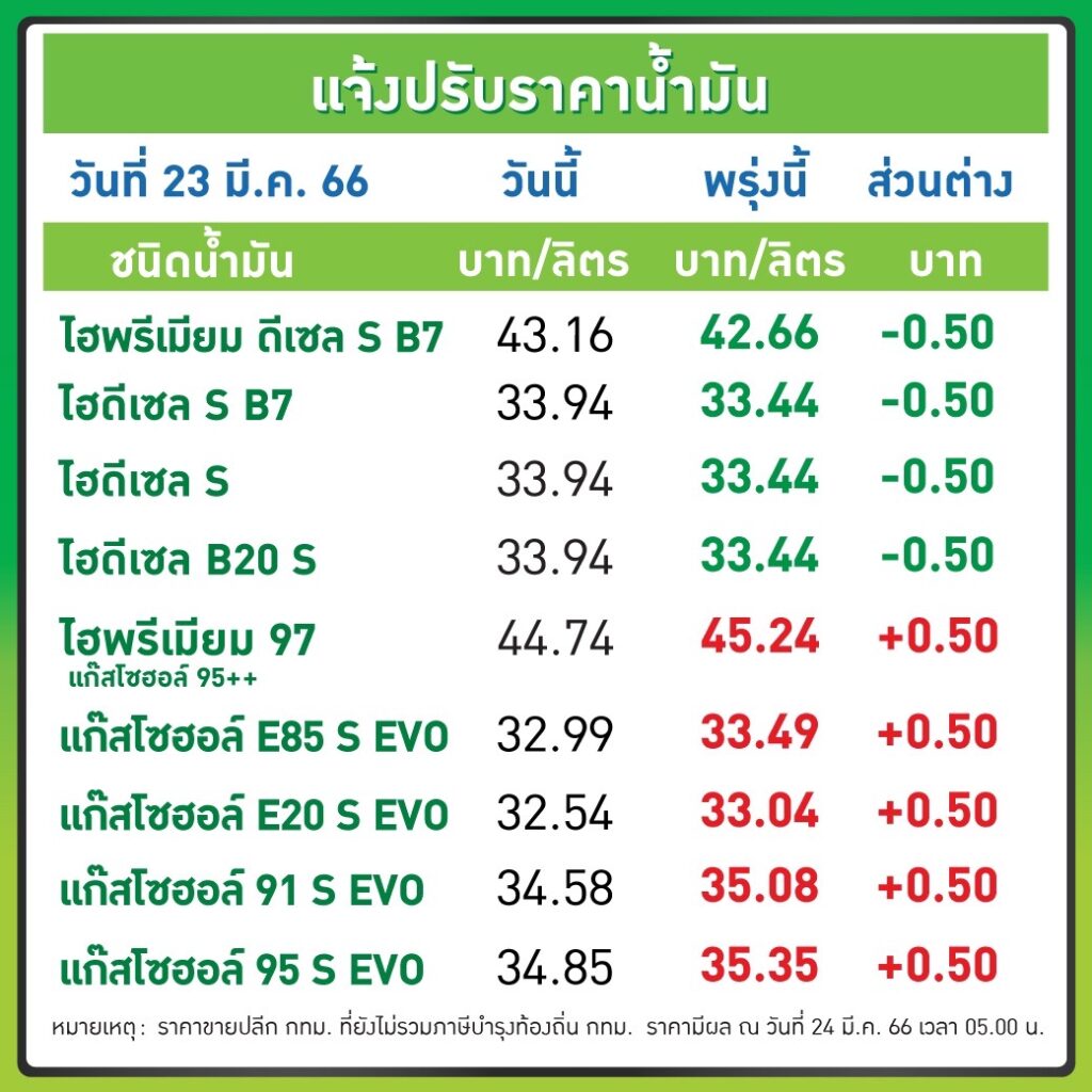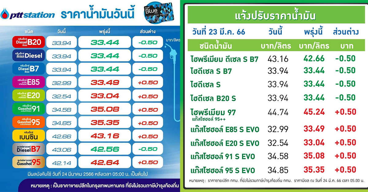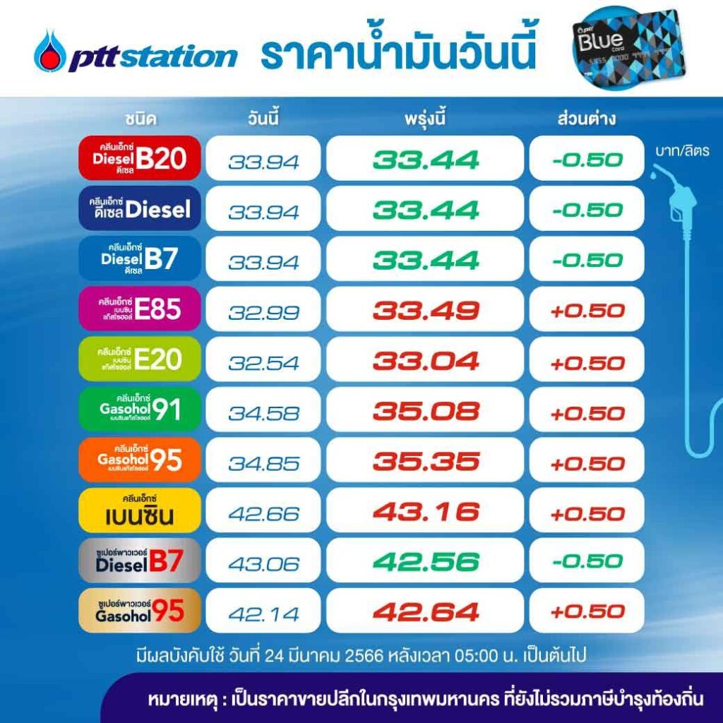 PTT Station ปรับราคาขายปลีกน้ำมันกลุ่มเบนซินและแก๊สโซฮอล์ทุกชนิดขึ้น 0.50 บาท/ลิตร ส่วนกลุ่มดีเซลทุกชนิดลง 0.50 บาท/ลิตร มีผล 24 มี.ค. 2566 เวลา 05.00 น. เป็นต้นไป โดยราคาขายปลีกจะเป็นดังนี้ ULG = 43.16, GSH95 = 35.35, E20 = 33.04, GSH91 = 35.08, E85 = 33.49, พรีเมี่ยม GSH95 = 42.64, HSD-B7 = 33.44, HSD-B10 = 33.44, HSD-B20 = 33.44, พรีเมี่ยมดีเซล B7 = 42.56 บาทต่อลิตร โดยราคาขายปลีกข้างต้นยังไม่รวมภาษีบำรุงกรุงเทพมหานคร