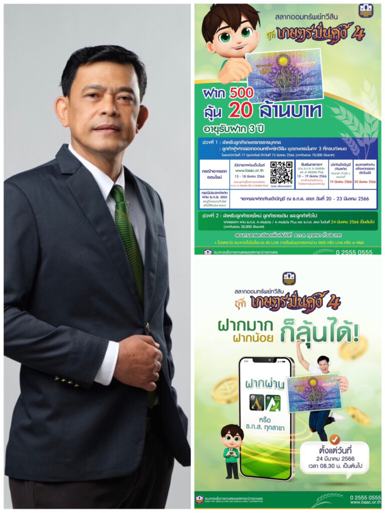 กรุงเทพฯ 24 มี.ค.-ธ.ก.ส. เปิดรับฝาก “สลากออมทรัพย์ทวีสิน ชุดเกษตรมั่นคง 4” ช่วงที่ 2 สำหรับลูกค้าและประชาชนทั่วไป ตั้งแต่ 24 มีนาคม 2566 เป็นต้นไป วงเงินรวม 30,000 ล้านบาท หน่วยละ 500 บาท ฝากครบ 3 ปีได้รับดอกเบี้ยหน่วยละ 5 บาท พร้อมลุ้นรางวัลใหญ่ 20 ล้านบาท และรางวัลอื่น ๆ รวมมูลค่ากว่า 107 ล้านบาทต่อเดือน เปิดรับฝากผ่านแอปพลิเคชัน ธ.ก.ส. A-Mobile หรือ A-Mobile Plus และ ธ.ก.ส. ทุกสาขาทั่วประเทศ
