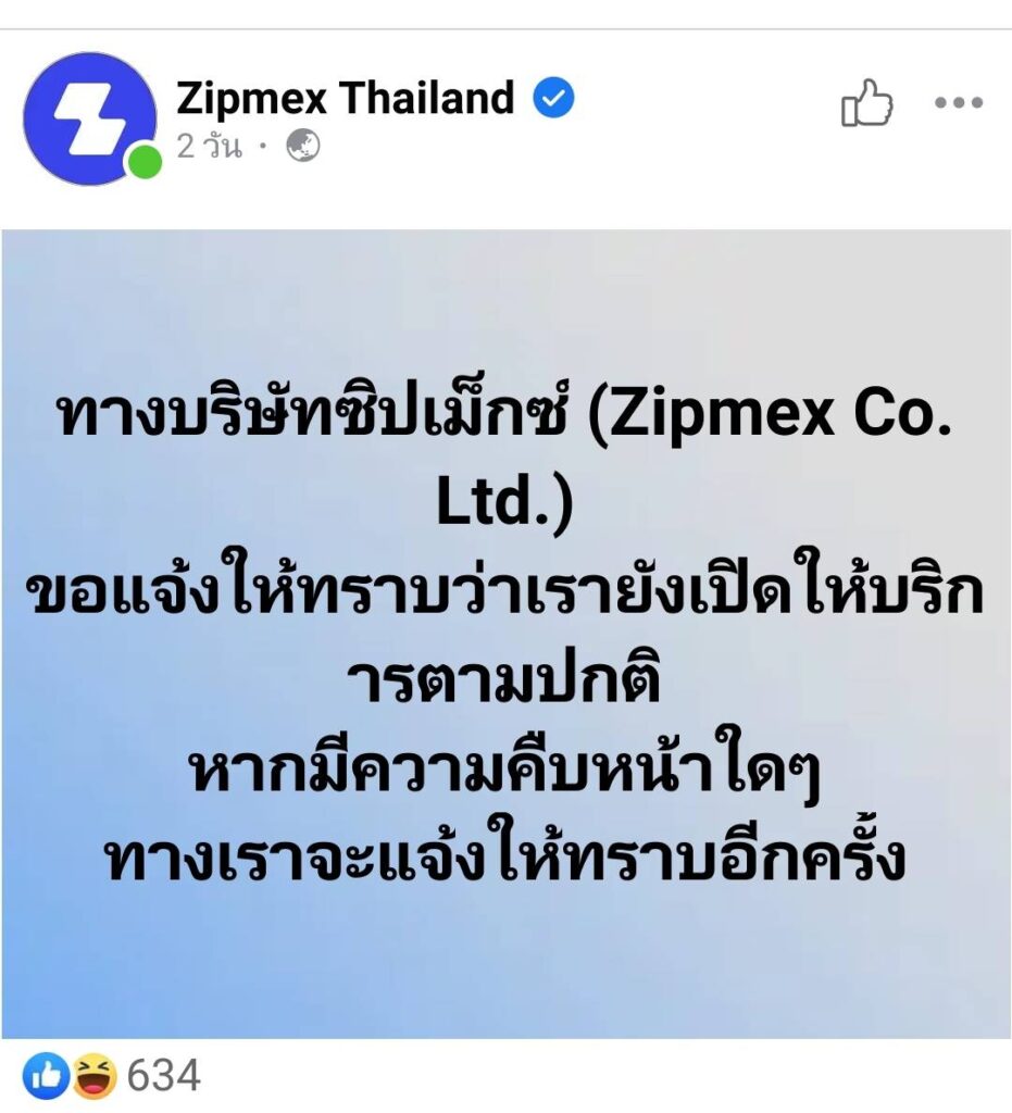 ด้าน Zipmex ได้โพสต์ข้อความ ในเฟซบุ๊ก เมื่อ 2 วันก่อนหลังมีรายงานข่าวดังกล่าวว่า ทางบริษัท ซิปเม็กซ์ (Zipmex Co. Ltd.) ขอแจ้งว่ายังเปิดให้บริการตามปกติ หากมีความคืบหน้าใดๆ จะแจ้งให้ทราบอีกครั้ง อย่างไรก็ตาม ในส่วนของการแสดงความเห็นของผู้มช้บริหาร ส่วนใหญ่จะเป็นการแจ้งปัญหาการใช้บริการเป็นหลัก .–สำนักข่าวไทย
