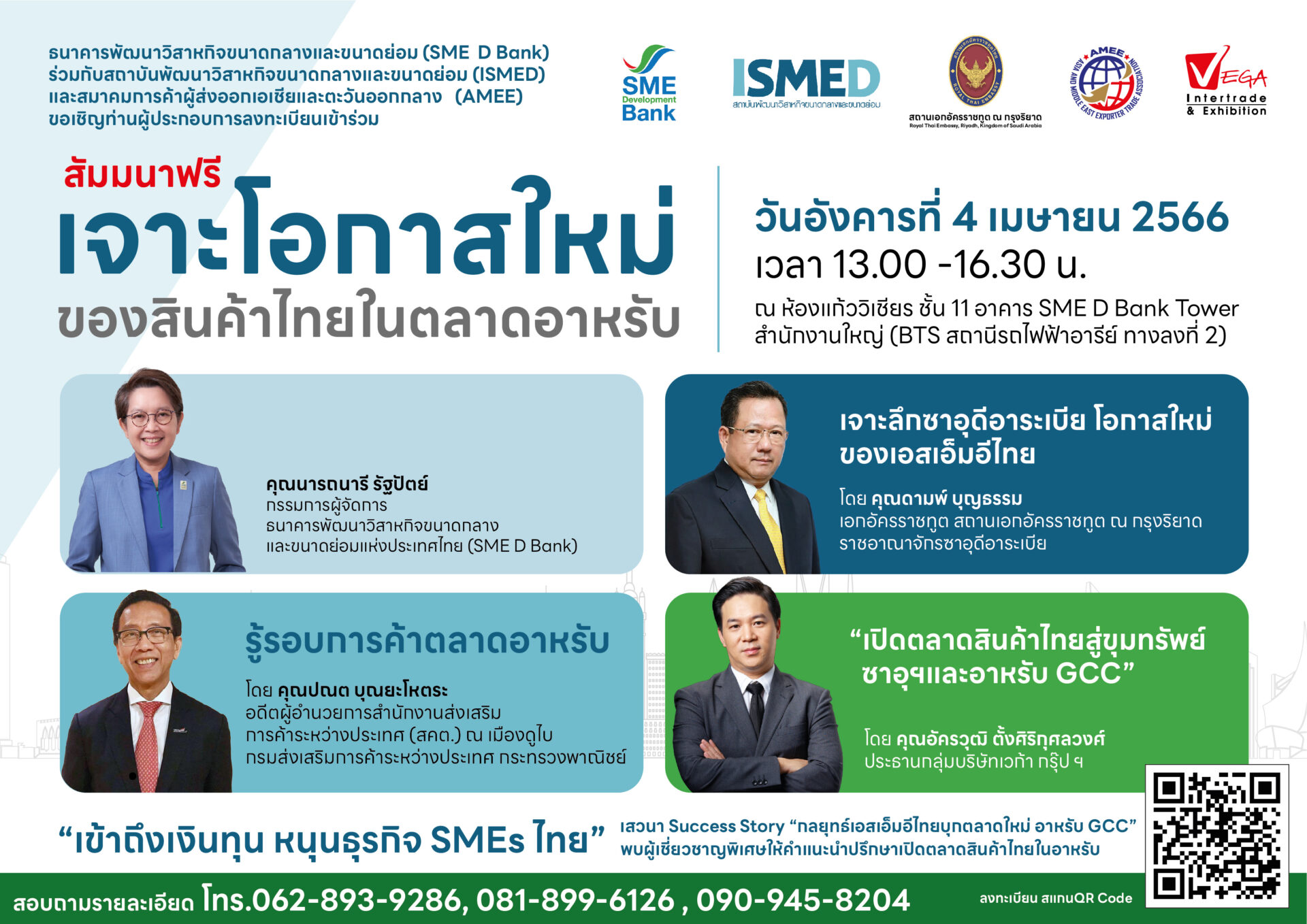 ธนาคารพัฒนาวิสาหกิจขนาดกลางและขนาดย่อมแห่งประเทศไทย (ธพว.) หรือ SME D Bank ร่วมกับ สถาบันพัฒนาวิสาหกิจขนาดกลางและขนาดย่อม (ISMED) และสมาคมการค้าผู้ส่งออกเอเชียและตะวันออกกลาง(AMEE) ขอเชิญผู้ประกอบการเอสเอ็มอี คว้าโอกาสครั้งสำคัญที่จะขยายตลาดใหม่ พาสินค้าส่งออกไปยังกลุ่มประเทศตะวันออกกลาง ซึ่งมีกำลังซื้อมหาศาล รับรู้ข้อมูลที่สำคัญ และจำเป็นได้ในงานสัมมนา “เจาะโอกาสใหม่ของสินค้าไทยในตลาดอาหรับ” ในวันอังคารที่ 4 เมษายน 2566 เวลา 13.00 -16.30 น. ณ ห้องแก้ววิเชียร ชั้น 11 อาคาร SME D Bank Tower สำนักงานใหญ่ (BTS อารีย์ ทางออกที่ 2)