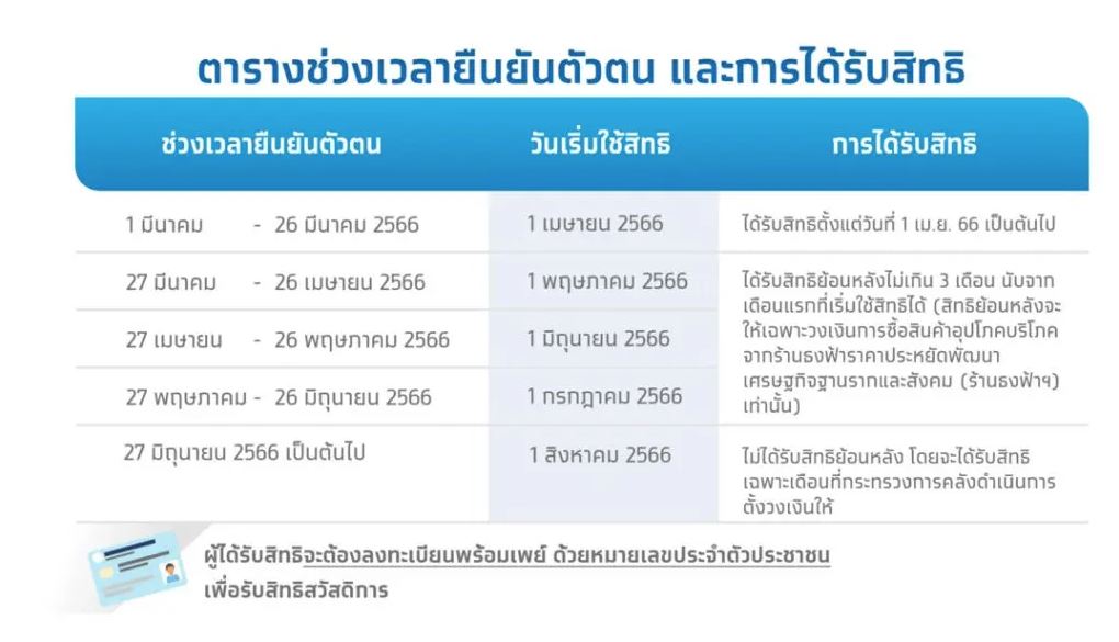 โฆษกกระทรวงการคลัง กล่าวเน้นย้ำว่า ผู้ผ่านเกณฑ์ที่ยังไม่ได้ยืนยันตัวตนและผู้ผ่านเกณฑ์ที่ยังยืนยันตัวตนไม่สำเร็จ ภายในวันที่ 26 มีนาคม 2566 จำนวน 2 ล้านราย ยังคงสามารถยืนยันตัวตนได้ที่ ธนาคารกรุงไทย ธนาคารออมสิน และ ธ.ก.ส. ตามวันเวลาที่หน่วยงานกำหนด และสามารถเริ่มใช้สิทธิสวัสดิการแห่งรัฐได้ตามวันที่กระทรวงการคลังกำหนด โดยรายละเอียดช่วงเวลาการยืนยันตัวตนและวันที่เริ่มใช้สิทธิ ปรากฏตามตาราง