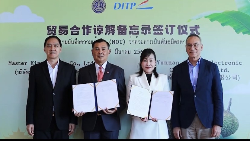 นอกจากนี้ กรมส่งเสริมการค้าระหว่างประเทศ ได้มีการลงนาม MOU ซื้อขายผลไม้ไทย ระหว่างคุณจันทร์จิรา อนันต์ชัยพัฒนา ประธานสมาคมนักธุรกิจไทยในจีนตะวันตกเฉียงใต้ กับประธานบริษัท Yunnan Dimiao Electronic Commerce Co., Ltd. และนายพรเทพ ศักดิ์สุจริต กรรมการผู้จัดการบริษัท มาสเตอร์ คิง ฟรุตส์ จำกัด โดยตกลงซื้อทุเรียนรวมมูลค่ากว่า 500 ล้านบาท ภายใน 5 ปี และเน้นขาย Online Marketing เป็นหลัก และในวันนี้ (28 มี.ค.)จะเดินทางไปพบหารือผู้บริหารด่านศุลกากรสำคัญในมณฑลนาน เช่น ด่านโม่ฮาน ด่านรถไฟโม่ฮาน โดยเฉพาะพื้นที่ลานตรวจสอบจำเพาะของสินค้าผลไม้ เพื่อเตรียมความพร้อมรองรับการขนส่งในฤดูผลไม้ของไทยผ่านด่านสำคัญของจีน