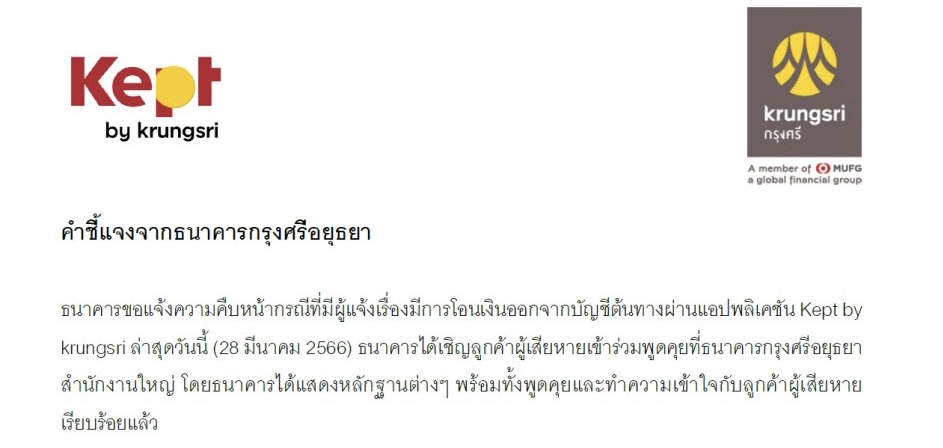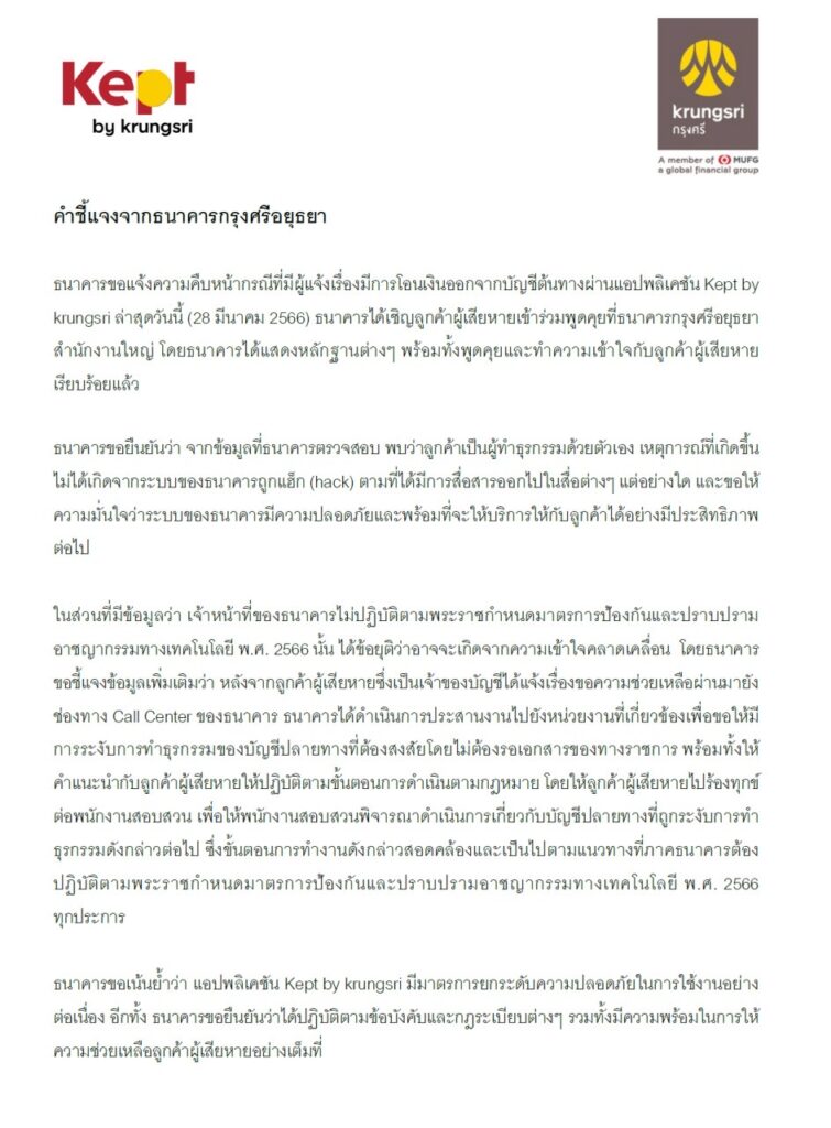 ธนาคารกรุงศรีอยุธยา (BAY) ชี้แจงกรณีมีผู้โพสต์ลงโซเชียลมีเดียว่าถูกลักลอบถอนเงินฝากดิจิทัลอยู่ในแอปพลิเคชัน Kept by krungsri โดยทยอยทำรายการโอนออกไปตั้งแต่เวลา 01.00 น. จนถึงเวลา 04.00 น. จนเงินฝากที่มีอยู่กว่า 3 แสนบาท เหลือแค่ 17,000 บาท และเมื่อแจ้งให้ทางธนาคารอายัดบัญชีปลายทาง แต่ได้รับการตอบกลับว่าไม่สามารถดำเนินการได้ จึงได้เข้าแจ้งความกับเจ้าหน้าที่ตำรวจ ต่อมาได้รับแจ้งจากเจ้าหน้าที่ธนาคารว่าได้ประสานงานอายัดบัญชีปลายทางไว้ 72 ชม.แล้ว