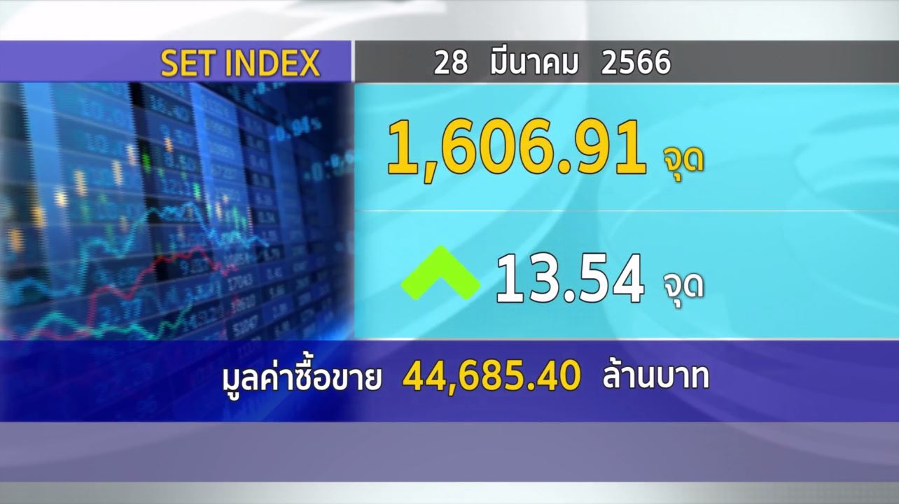 SET ปิดวันนี้ที่ 1,606.91 จุด เพิ่มขึ้น 13.54 จุด (+0.85%) มูลค่าการซื้อขาย 44,685.40 ล้านบาท นักวิเคราะห์ฯ เผยตลาดหุ้นไทยวันนี้ปรับเพิ่มขึ้น ตามทิศทางเดียวกับตลาดหุ้นต่างประเทศ รับ sentiment เชิงบวกคลายกังวลแบงก์ในสหรัฐฯ First Citizens BancShares บรรลุข้อตกลงซื้อ SVB ส่งผลหนุนแรงซื้อหุ้นกลุ่มแบงก์ไทย ช่วยดันดัชนี และแรงซื้อหุ้นพลังงานช่วยหนุน แนวโน้มพรุ่งนี้ (29 มี.ค.) คาดแกว่งไซด์เวย์ โดยยังไร้ปัจจัยใหม่ พร้อมติดตามประชุม กนง.พรุ่งนี้ พร้อมให้แนวต้าน 1,615-1,620 จุด แนวรับ 1,585-1,590 จุด