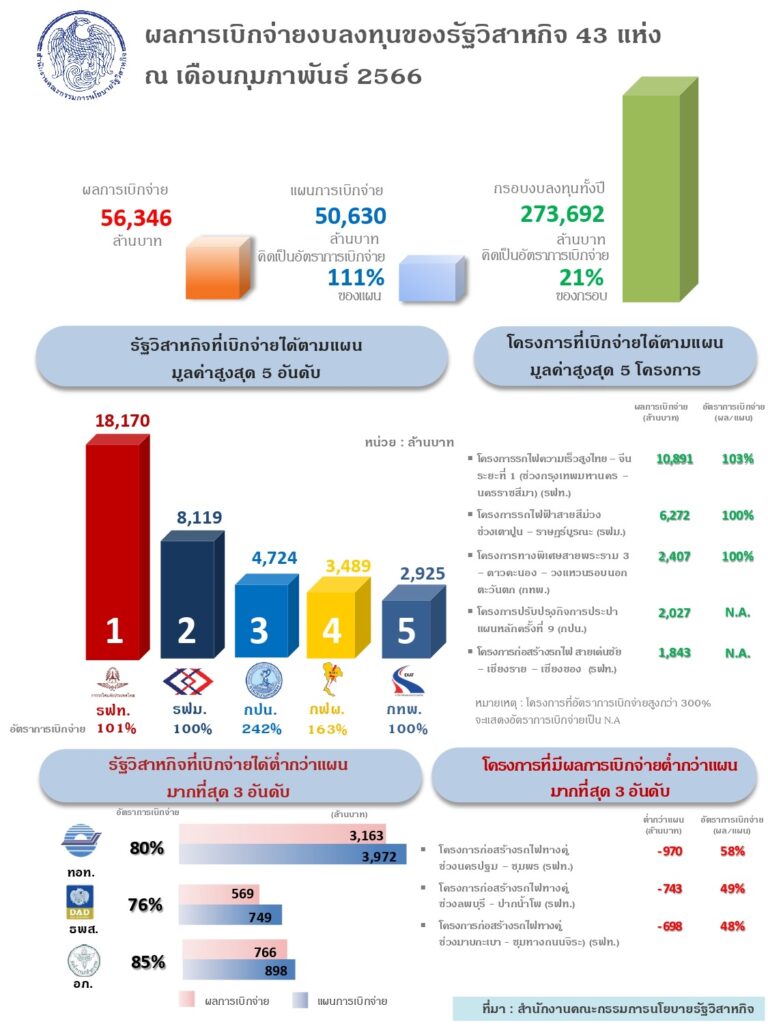 นางปานทิพย์ ศรีพิมล ผู้อำนวยการสำนักงานคณะกรรมการนโยบายรัฐวิสาหกิจ (สคร.) เปิดเผยว่า ในปี 2566 รัฐวิสาหกิจมีการเบิกจ่ายงบลงทุนจนถึงเดือนกุมภาพันธ์ 2566 จำนวน 56,346 ล้านบาท หรือคิดเป็นร้อยละ 111 ของแผนการเบิกจ่าย ประกอบด้วยการเบิกจ่ายงบลงทุนของรัฐวิสาหกิจปีงบประมาณ (ตั้งแต่เดือนตุลาคม 2565 – เดือนกุมภาพันธ์ 2566) 34 แห่ง จำนวน 43,524 ล้านบาท หรือคิดเป็นร้อยละ 107 ของแผนการเบิกจ่าย และรัฐวิสาหกิจปีปฏิทิน (เดือนมกราคม 2566 – เดือนกุมภาพันธ์ 2566) 9 แห่ง จำนวน 12,822 ล้านบาท หรือคิดเป็นร้อยละ 129 ของแผนการเบิกจ่าย