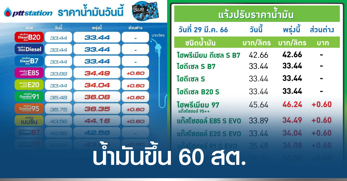 PTT Station ปรับราคาขายปลีกน้ำมันกลุ่มเบนซินและแก๊สโซฮอล์ทุกชนิดเพิ่มขึ้น 0.60 บาท/ลิตร ส่วนกลุ่มดีเซลคงเดิม มีผล 30 มี.ค.66 เวลา 05.00 น. เป็นต้นไป โดยราคาขายปลีกจะเป็นดังนี้ ULG = 44.16, GSH95 = 36.35, E20 = 34.04, GSH91 = 36.08, E85 = 34.49, พรีเมียม GSH95 = 43.64, HSD-B7 = 33.44, HSD-B10 = 33.44, HSD-B20 = 33.44, พรีเมียมดีเซล B7 = 42.56 บาท/ลิตร โดยราคาขายปลีกข้างต้นยังไม่รวมภาษีบำรุงกรุงเทพมหานคร