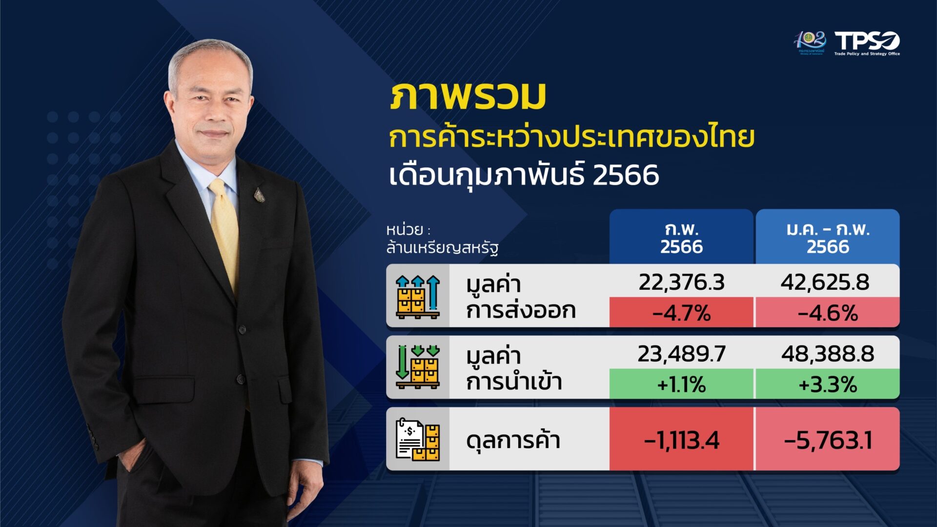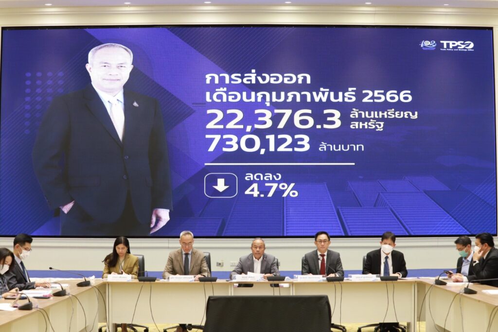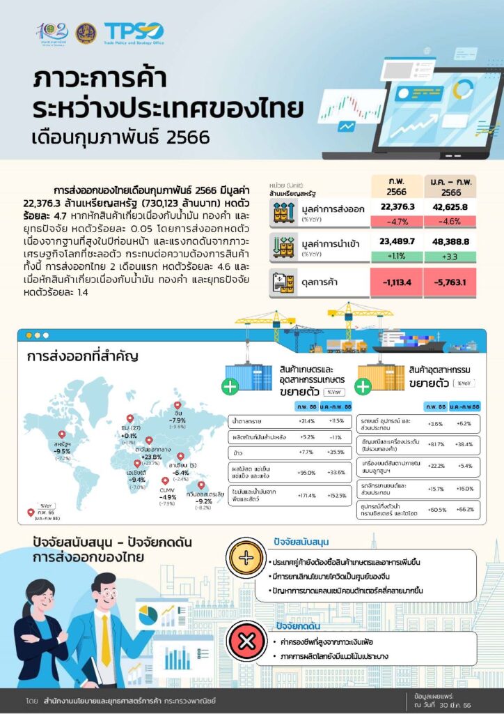 นายสินิตย์ เลิศไกร รัฐมนตรีช่วยว่าการกระทรวพาณิชย์ รายงานตัวเลขการส่งออกของไทย ในเดือนกุมภาพันธ์ 2566 พบว่า มีมูลค่า 22,376.3 ล้านเหรียญสหรัฐฯ หดตัวต่อเนื่องเป็นเดือนที่ 5 ติดลบ 4.7% เนื่องจากสินค้าส่งออกหลายกลุ่มมีทั้งเพิ่มขึ้นและลดลง โดยในกลุ่มสินค้าเกษตรขยายตัว 1.5 % อุตสาหกรรมเกษตรขยายตัว5.6% และสินค้าอุตสาหกรรมติดลบ 6.2% จากปัญหาภาวะอัตราเงินเฟ้อทั่วโลกยังสูงอยู่ ทำให้ประเทศคู่ค้าชะลอคำสั่งซื้อสินค้าเพิ่มเติมรวมถึงสินค้าฟุ่มเฟือยด้วยอีกทั้งภาคการผลิตโลกยังหดตัวส่งผลให้ยอดส่งออกสินค้าทั้งเคมีภัณฑ์และเครื่องจักรกลไม่เพิ่มขึ้นมากนัก จึงเป็นอัตราที่ชะลอลงจากเดือนก่อนหน้าเล็กน้อย