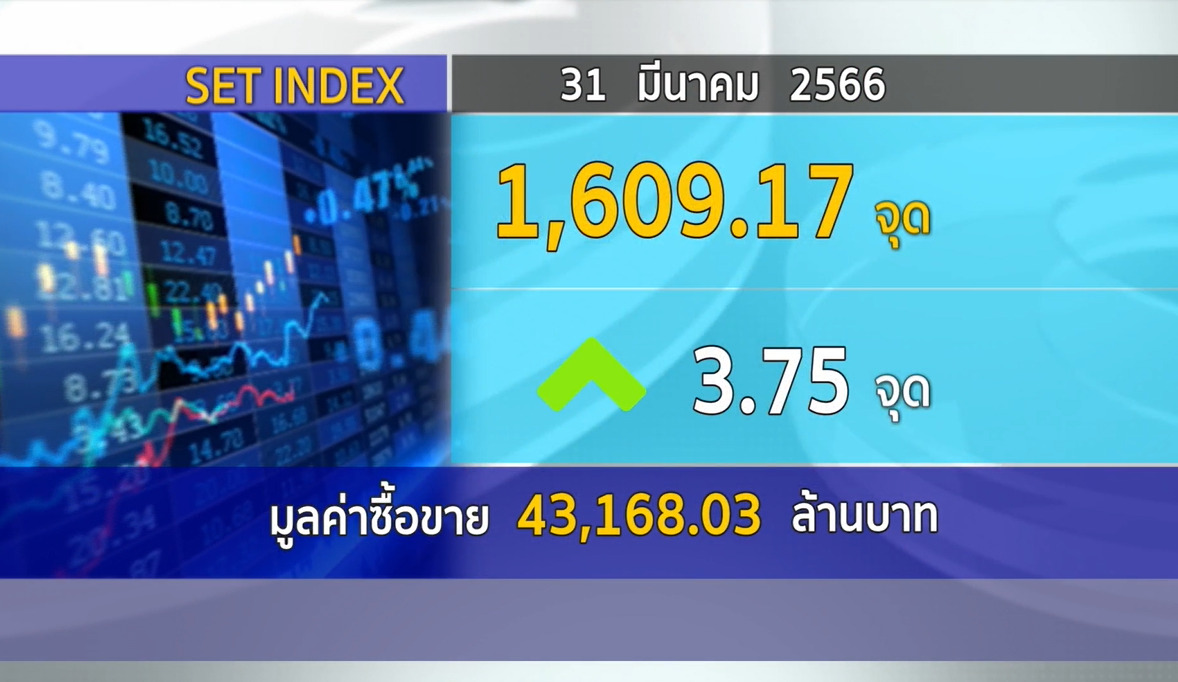 กทม. 31 มี.ค.-SET ปิดวันนี้ที่ 1,609.17 จุด เพิ่มขึ้น 3.75 จุด (+0.23%) มูลค่าการซื้อขาย 43,181.51 ล้านบาท