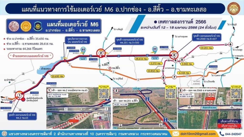 อธิบดีกรมทางหลวง กล่าวต่อไปว่า กรมทางหลวงจะเปิดให้บริการทางหลวงพิเศษหมายเลข 6 ช่วง ปากช่อง – สีคิ้ว – ขามทะเลสอ ระยะทาง 64 กิโลเมตร ตั้งแต่วันที่ 12 – 18 เมษายน 2566 ตลอด 24 ชั่วโมง (โดยจัดการจราจรแบบเดินรถทางเดียว ช่วงเดินทางขาออกจากกรุงเทพฯ วันที่ 12 – 14 เม.ย. 66 และช่วงเดินทางขาเข้ากรุงเทพฯ วันที่ 15 – 18 เม.ย. 66) เพื่อเพิ่มประสิทธิภาพในการเดินทางสู่ภาคตะวันออกเฉียงเหนือ โดยผู้ใช้ทางสามารถติดตามการรายงานสภาพจริงการจราจร Online แบบ Real time ผ่านแอปพลิเคชัน M-Traffic (มอเตอร์เวย์) / Thailand Highway Traffic และเฟซบุ๊ก “ศูนย์บริหารจัดการจราจรและอุบัติเหตุกรมทางหลวง”