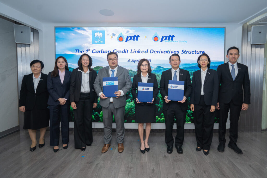 นายรวินทร์ บุญญานุสาสน์ รองกรรมการผู้จัดการใหญ่ สายงานธุรกิจตลาดเงินตลาดทุน ธนาคารกรุงไทย จำกัด (มหาชน) เปิดเผยว่า ธนาคารกรุงไทย ลงนามบันทึกข้อตกลงกับ บริษัท ปตท.จำกัด (มหาชน) (ปตท.) และ บริษัท PTT International Trading Pte Ltd ประเทศสิงคโปร์ (PTTT ถือหุ้น 100% โดย ปตท.) ในการเข้าทำสัญญาอนุพันธ์ป้องกันความเสี่ยงเชื่อมโยงคาร์บอนเครดิต หรือ Carbon Credit Linked Derivatives นับเป็นนวัตกรรมใหม่ของตลาดทุนไทย ในการส่งเสริมเป้าหมายการลดการปล่อยก๊าซเรือนกระจกของทั้งสองบริษัท