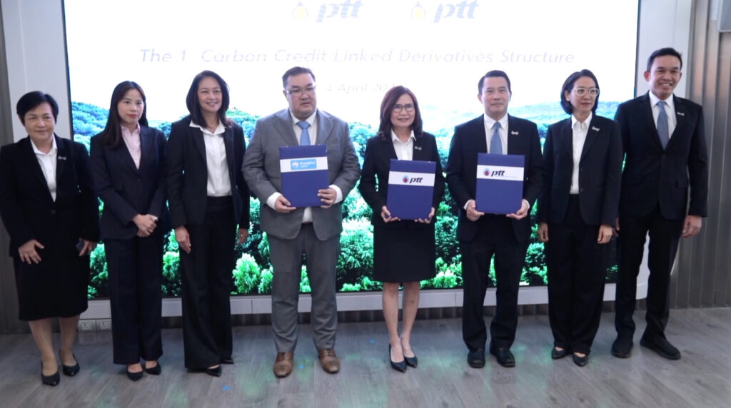 บริษัท ปตท. จำกัด (มหาชน) (ปตท.) ร่วมกับ ธนาคารกรุงไทย จำกัด (มหาชน) และ บริษัท PTT International Trading Pte Ltd ประเทศสิงคโปร์ (PTTT บริษัทลูกของ ปตท.) ลงนามบันทึกข้อตกลง ในการเข้าทำสัญญาอนุพันธ์ป้องกันความเสี่ยงเชื่อมโยงคาร์บอนเครดิต ซึ่งนับเป็นนวัตกรรมใหม่ของตลาดทุนไทย ที่ธนาคารได้ออกแบบและพัฒนาเพื่อตอบโจทย์ความต้องการด้านการบริหารความเสี่ยงทางการเงินของ ปตท. รวมถึงเป็นการส่งเสริมเป้าหมายการลดการปล่อยก๊าซเรือนกระจกของทั้งสองบริษัท นอกจากนี้ยังช่วยพัฒนาตลาดการซื้อขายคาร์บอนเครดิตระหว่างองค์กรในประเทศ โดย PTTT ประเทศสิงคโปร์ จะทำหน้าที่เป็นผู้จัดหาคาร์บอนเครดิตที่มีมาตรฐานให้เพื่อใช้สำหรับลดการปล่อยก๊าซเรือนกระจกในกิจกรรมต่างๆ ในอนาคต นอกจากนี้ ข้อตกลงยังครอบคลุมถึงการบรรลุเป้าหมายด้าน ESG ของ ปตท.