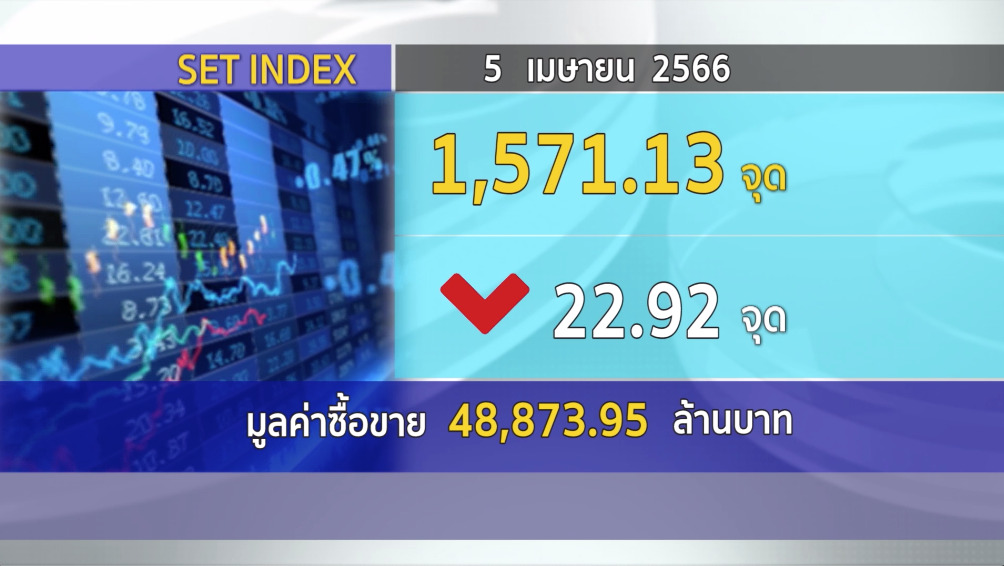 กทม. 5 เม.ย.- SET ปิดวันนี้ที่ 1,571.13 จุด ลดลง 22.92 จุด (-1.44%) มูลค่าการซื้อขาย 48,882.58 ล้านบาท