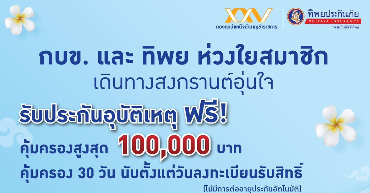 กรุงเทพฯ 7 เม.ย.- กบข. ร่วมกับ ทิพยประกันภัย มอบประกันอุบัติเหตุฟรี 3 หมื่นสิทธิ์ ให้แก่สมาชิกข้าราชการ คุ้มครอง 30 วัน วงเงินคุ้มครองสูงสุด 1 แสนบาท ลงทะเบียนรับสิทธิ์วันนี้ถึง 12 เมษายน 2566