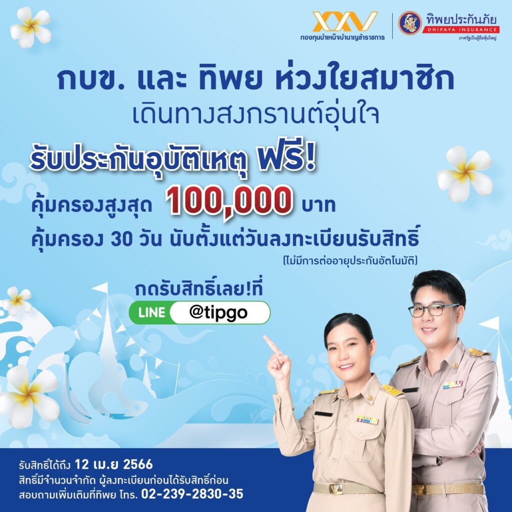 ดร.ศรีกัญญา ยาทิพย์ เลขาธิการคณะกรรมการกองทุนบำเหน็จบำนาญข้าราชการ (กบข.) เปิดเผยว่า กบข. ห่วงใยสมาชิกจึงได้ร่วมกับ บริษัท ทิพยประกันภัย จำกัด (มหาชน) มอบสิทธิพิเศษ “ประกันอุบัติเหตุ” วงเงินคุ้มครองสูงสุด 100,000 บาท โดยไม่เสียค่าใช้จ่าย จำนวน 30,000 สิทธิ์ เพื่อให้สมาชิกอุ่นใจในการเดินทางท่องเที่ยว หรือกลับภูมิลำเนาในช่วงเทศกาลสงกรานต์