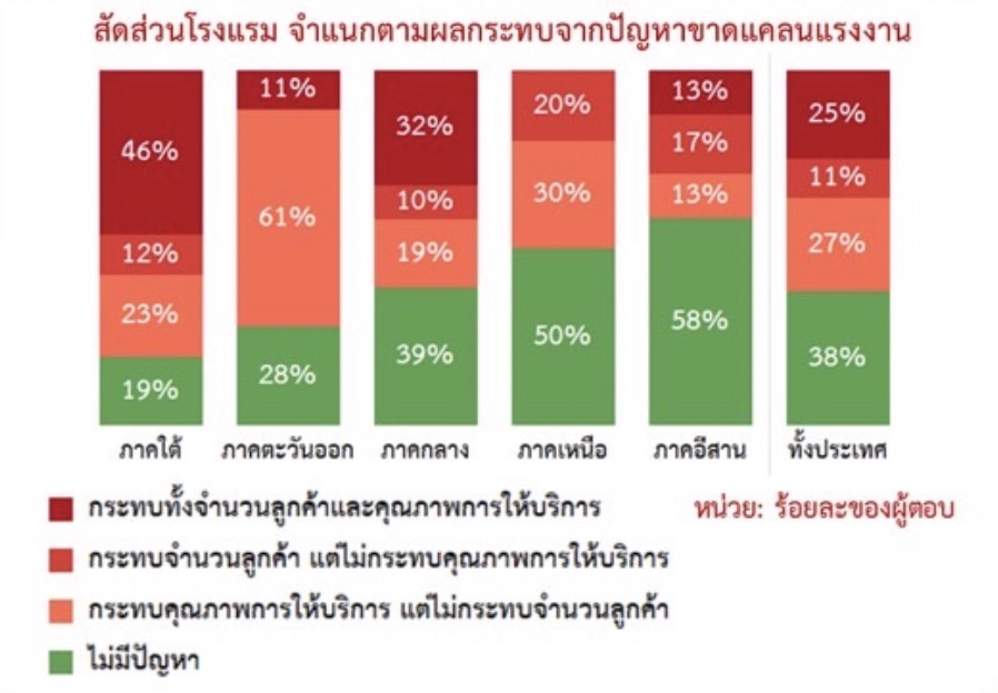 ขณะที่การจ้างงานพบว่า ผู้ประการโรงแรม 62% ยังเผชิญปัญหาขาดแคลนแรงงาน โดย 25% มีปัญหาขาดแคลนแรงงานที่กระทบทั้งจำนวนลูกค้าและคุณภาพบริการ โดยเฉพาะโรงแรมภาคใต้ และภาคกลางที่มีอัตราการเข้าพักอยู่ในระดับสูง ขณะที่โรงแรมในภาคตะวันอกส่วนใหญ่กระทบคุณภาพการให้บริการเป็นหลัก