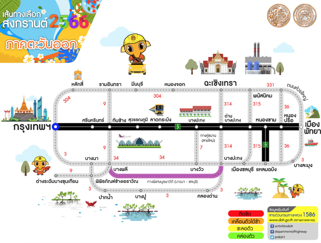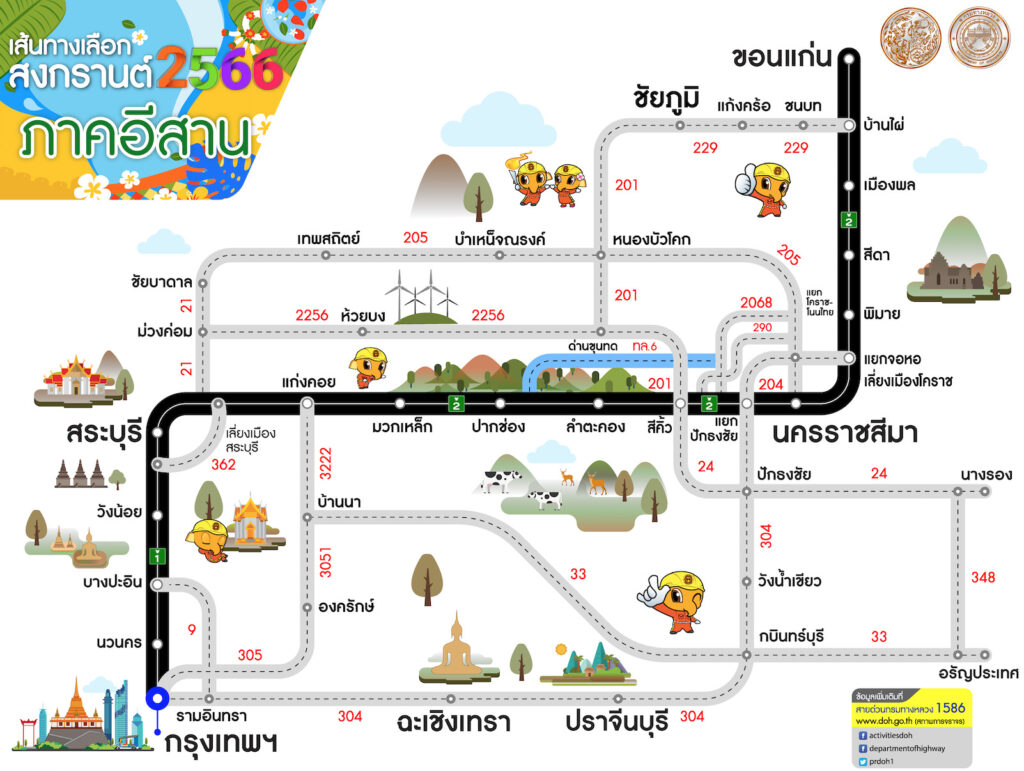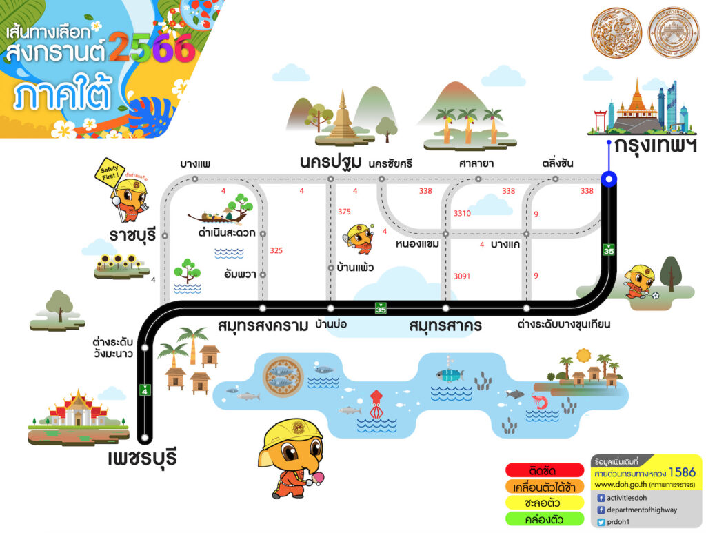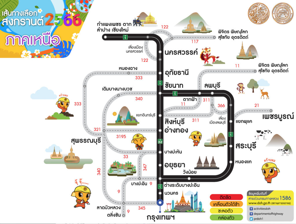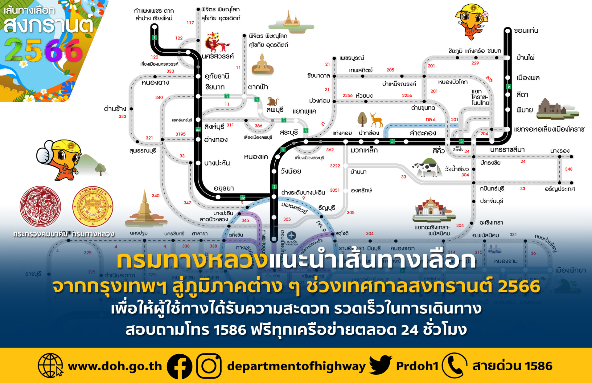 กรุงเทพฯ 8 เม.ย.- กรมทางหลวงแนะนำเส้นทางเลือกจากกรุงเทพฯ สู่ภูมิภาคต่าง ๆ ช่วงเทศกาลสงกรานต์ 2566 เพื่อให้ผู้ใช้เส้นทางได้รับความสะดวกรวดเร็วในการเดินทาง สอบถามโทร 1586 ฟรีทุกเครือข่ายตลอด 24 ชั่วโมง