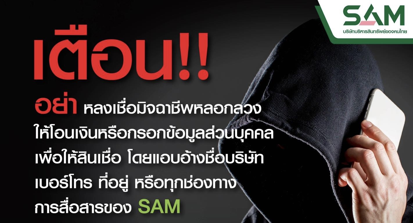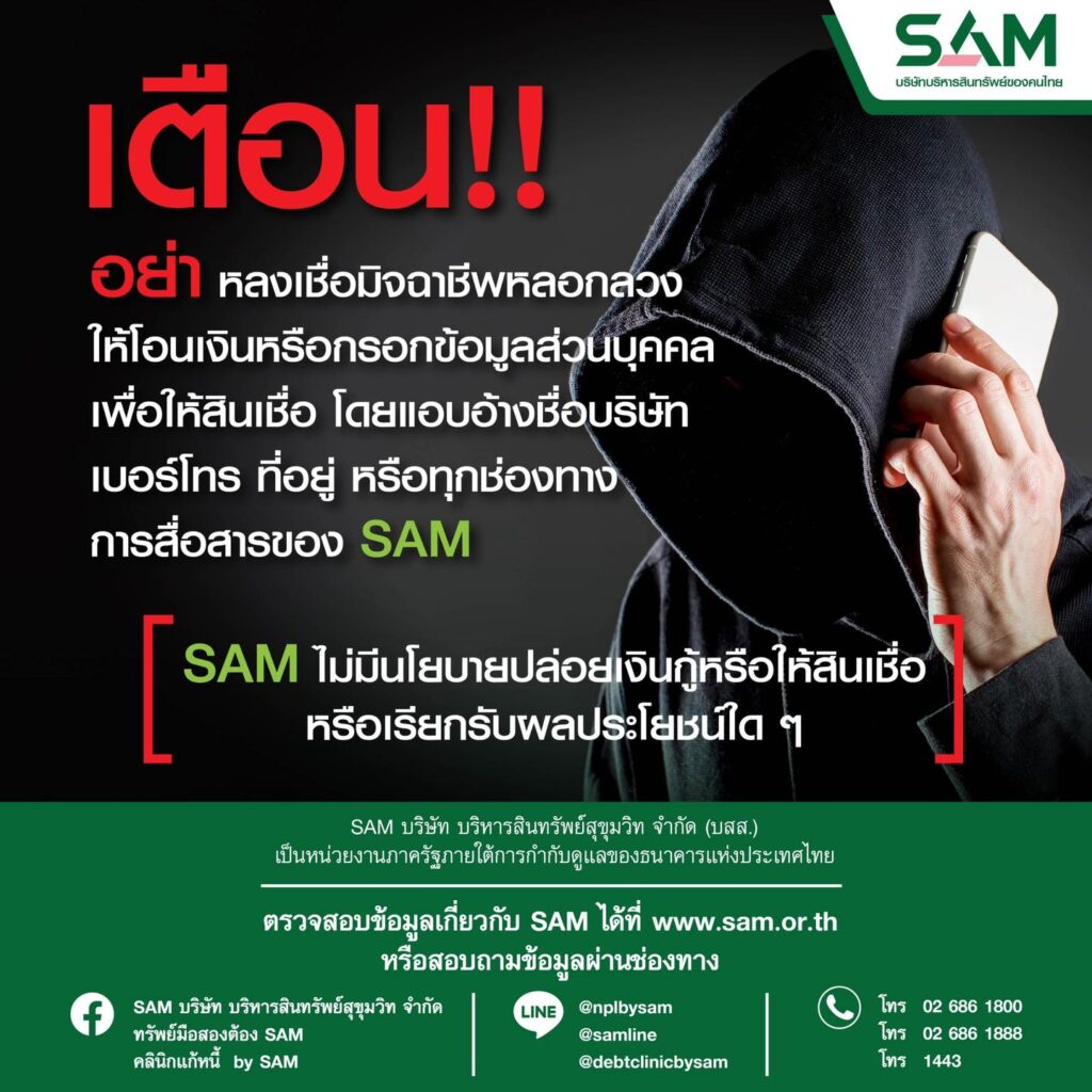 อย่างไรก็ตาม SAM ขอยืนยันว่า SAM ไม่มีนโยบายให้สินเชื่อหรือเรียกรับผลประโยชน์ใดๆ ทั้งสิ้น และขอย้ำเตือนให้ลูกค้า ประชาชน เพิ่ม ความระมัดระวังมิจฉาชีพที่แอบแฝงและใช้ช่องทางการสื่อสารดังกล่าวของ SAM แสวงหาผลประโยชน์ในทางมิชอบ อย่า หลงเชื่อให้ข้อมูลส่วนตัว หรือโอนเงินไปให้กับกลุ่มมิจฉาชีพดังกล่าว และ SAM ขอแจ้งให้ประชาชนทราบว่า SAM เป็นหน่วยงานภาครัฐภายใต้การกำกับดูแลของธนาคารแห่งประเทศไทย (ธปท.) มีภารกิจสำคัญในการบริหารจัดการสินทรัพย์ด้อยคุณภาพของประเทศ ด้วยการปรับโครงสร้างหนี้ NPL และการบริหารจัดการทรัพย์สินรอการขาย NPA รวมทั้งโครงการคลินิกแก้หนี้ เพื่อช่วยแก้ไขปัญหาหนี้สินและระบบเศรษฐกิจ สังคมไทยกลับคืนสู่ความมั่นคงและยั่งยืน ทั้งนี้ หากลูกค้ามีความสงสัย เรื่องการแอบอ้างชื่อหรือเรื่องอื่นใดที่เกี่ยวกับ SAM หรือมีข้อสงสัย สามารถสอบถามและติดต่อกับ SAM ได้ที่