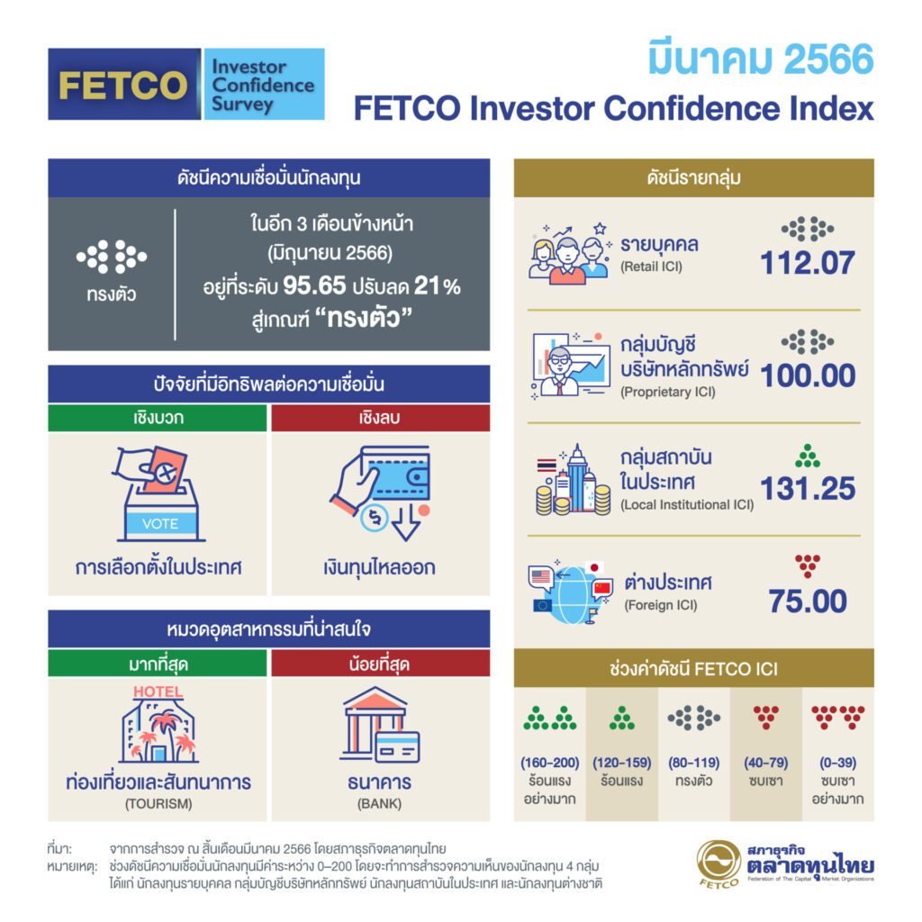 นายกอบศักดิ์ ภูตระกูล ประธานกรรมการสภาธุรกิจตลาดทุนไทย เปิดเผยดัชนีความเชื่อมั่นนักลงทุน (FETCO Investor Confidence Index) ผลสำรวจในเดือนมีนาคม 2566 พบว่าดัชนีความเชื่อมั่นนักลงทุน (FETCO Investor Confidence Index: ICI) ในอีก 3 เดือนข้างหน้าอยู่ที่ระดับ 95.65 ปรับตัวลดลง 21.0% จากเดือนก่อนหน้ามาอยู่ในเกณฑ์ “ทรงตัว” โดยในเดือนที่ผ่านมา SET index มีความผันผวนจากวิกฤตธนาคารจากการปิดตัวธนาคารสหรัฐและยุโรปนักลงทุนมองว่าการเลือกตั้งในประเทศจะเป็นปัจจัยหนุนความเชื่อมั่นมากที่สุด รองลงมาคือการชะลอการขึ้นดอกเบี้ยนโยบายของธนาคารกลางสหรัฐฯ (FED) และการฟื้นตัวของภาคท่องเที่ยว สำหรับปัจจัยที่ฉุดความเชื่อมั่นนักลงทุนมากที่สุด ได้แก่ ความกังวลต่อการไหลออกของเงินทุน รองลงมาคือแนวทางนโยบายการเงินของ FED เพื่อสกัดเงินเฟ้อ และสถานการณ์ส่งออกที่ชะลอตัว