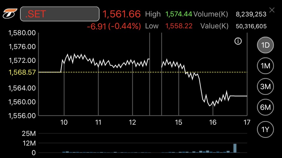 โดยดัชนีฯแตะจุดสูงสุดที่ 1,558.22 จุด และแตะจุดต่ำสุดที่ระดับ 1,574.44 จุด