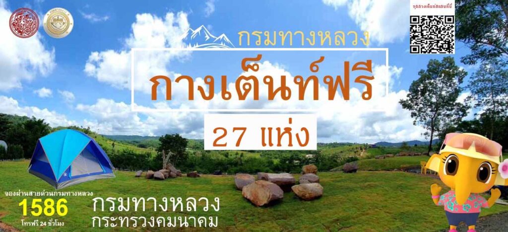 กรุงเทพฯ 12 เม.ย.- กรมทางหลวง เปิดหมวดทางหลวงใกล้แหล่งท่องเที่ยว 27 แห่ง ให้กางเต็นท์ฟรี เพื่ออำนวยความสะดวกและรองรับการท่องเที่ยวของประชาชนในช่วงเทศกาลสงกรานต์ 2566