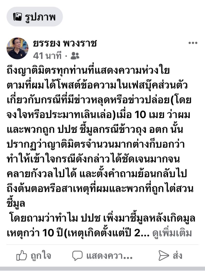 นายยรรยง พวงราช อดีตรัฐมนตรีช่วยว่าการกระทรวงพาณิชย์ได้กล่าวย้ำทางเฟสบุ๊คถึงญาติมิตรทุกท่านที่แสดงความห่วงใย ตามที่ตนได้โพสต์ข้อความในเฟสบุ๊คส่วนตัวเกี่ยวกับกรณีที่มีข่าวหลุดหรือข่าวปล่อย โดยจงใจหรือประมาทเลินเล่อ เมื่อวันที่ 10 เม.ย.ที่ผ่านมาว่าตนและพวกถูก ปปช ชี้มูลกรณีข้าวถุง อตก นั้น ปรากฏว่าญาติมิตรจำนวนมากต่างก็บอกว่าทำให้เข้าใจกรณีดังกล่าวได้ชัดเจนมากจนคลายกังวลไปได้ และตั้งคำถามย้อนกลับไปถึงต้นตอหรือสาเหตุที่ผมและพวกที่ถูกไต่สวนชี้มูล โดยถามว่าทำไม ปปช เพิ่งมาชี้มูลหลังเกิดมูลเหตุกว่า 10 ปี โดยเหตุเกิดตั้งแต่ปี 2555 และทำไมจึงชี้มูลเฉพาะเลขา กขช และผู้ช่วยเลขา กขช และผู้บริหาร อตก บางคนเท่านั้น