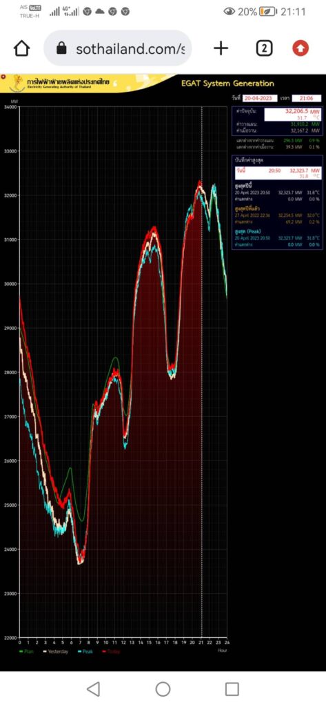 ผู้สื่อข่าวรายงานว่า อากาศร้อนจัดช่วงนี้ คนเปิดแอร์คลายร้อน ส่งผลความต้องการใช้ไฟฟ้าของประเทศในระบบ 3 การไฟฟ้า เกิดพีคหรือสูงสุดของปีต่อเนื่องและเมื่อวันที่ 20 เม.ย. เวลา20.50น. ยอดใช้ไฟฟ้าทำลายสถิติสูงสุด หรือนิวไฮ ของประเทศ ที่ 32,323.7 MW ส่งผลสำรองไฟฟ้าเหลือประมาณร้อยละ 36