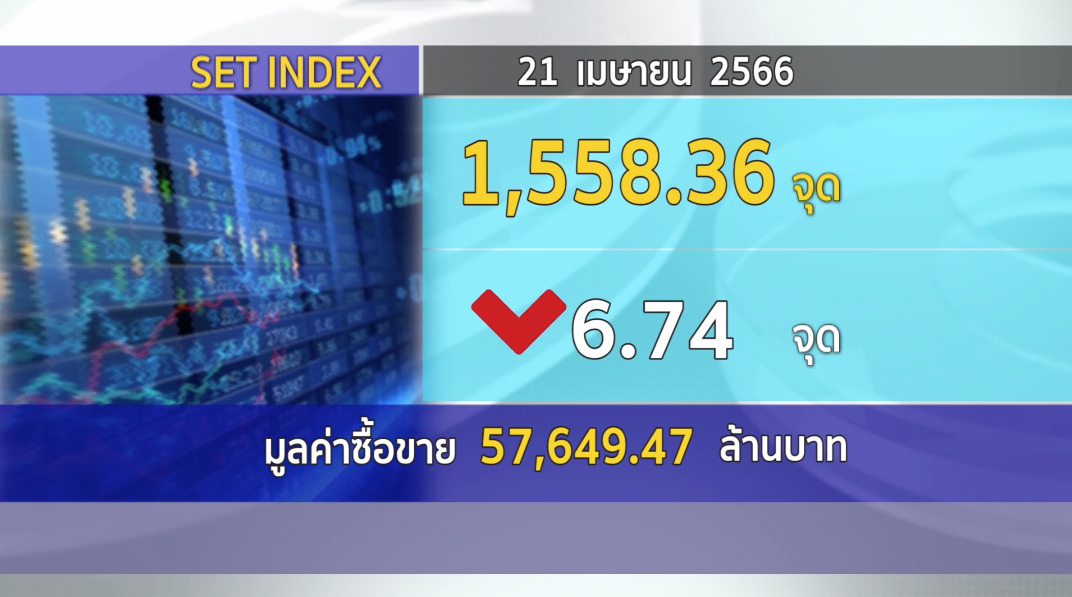กทม. 21 เม.ย.- SET ปิดวันนี้ที่ 1,558.36 จุด ลดลง 6.74 จุด (-0.43%) มูลค่าการซื้อขาย 57,649.47 ล้านบาท