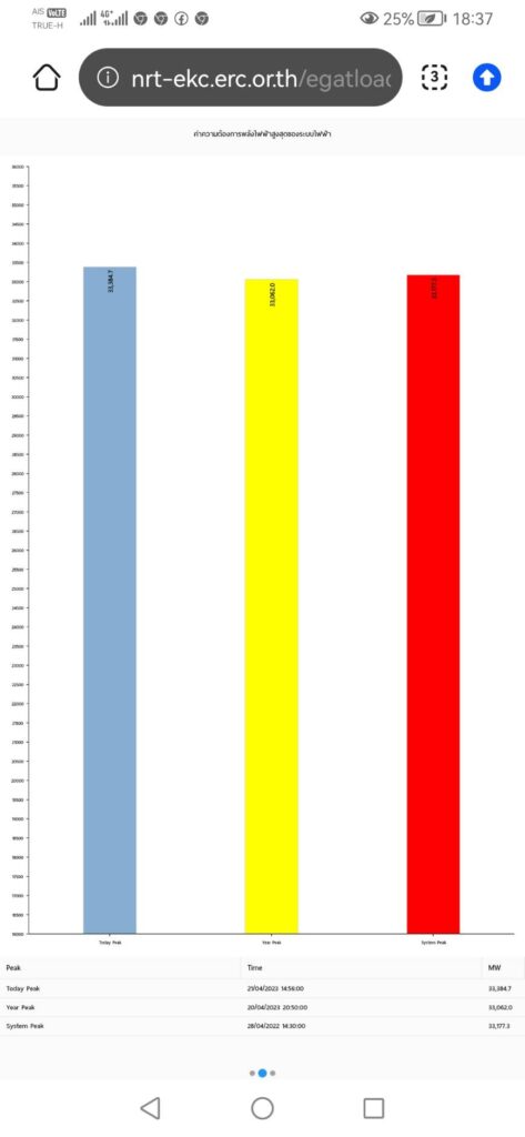 รายงานข่าวจากสำนักงานคณะกรรมการกำกับกิจการพลังงาน (สำนักงาน กกพ.) เปิดเผยว่าวันนี้ 21 เม.ย. 66 จากสภาพอากาศร้อนจัดทำให้ประชาชนหันมาเปิดเครื่องปรับอากาศ(แอร์) และพัดลมเพื่อคลายความร้อน ประกอบกับกิจกรรมการท่องเที่ยวที่ฟื้นตัวทำให้เกิดความต้องการใช้ไฟฟ้าสูงสุด (พีค) ในระบบของ 3 การไฟฟ้าอีกครั้ง เป็นรอบที่ 5 ของปีนี้และทำนิวไฮใหม่ อยู่ที่ 33,384.7 เมกะวัตต์ เวลา 14.56 น.